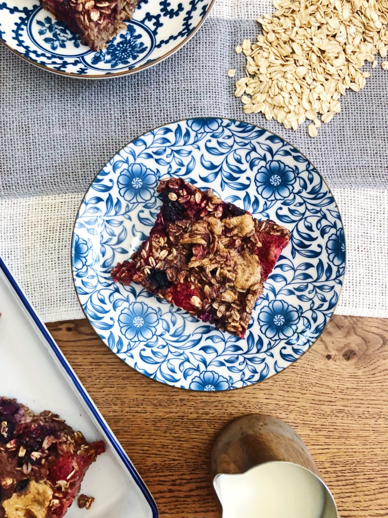 Oatmeal is a classic breakfast dish – but let’s be honest, oatmeal isn’t always the most satisfying thing to eat for breakfast. It can be mushy and bland if not cooked right and no one wants that to start their day off. That is where this baked berry oatmeal comes in! It is easy to make and you just pop it in the oven to cook and it will come out perfect each time. You can also make this ahead of time, store in the refrigerator, and heat it up in the microwave during the week. It will save you time during the week and make sure you have something tasty for breakfast. I used a berry blend for this recipe, but you could use your favorite berry instead. I also used almond butter but this can easily be swapped for peanut butter or sunflower butter! I do highly recommend eating this hot and pouring a bit of warm milk or cream over it when serving. For even more flavor, drizzle some extra nut butter on top right before serving.