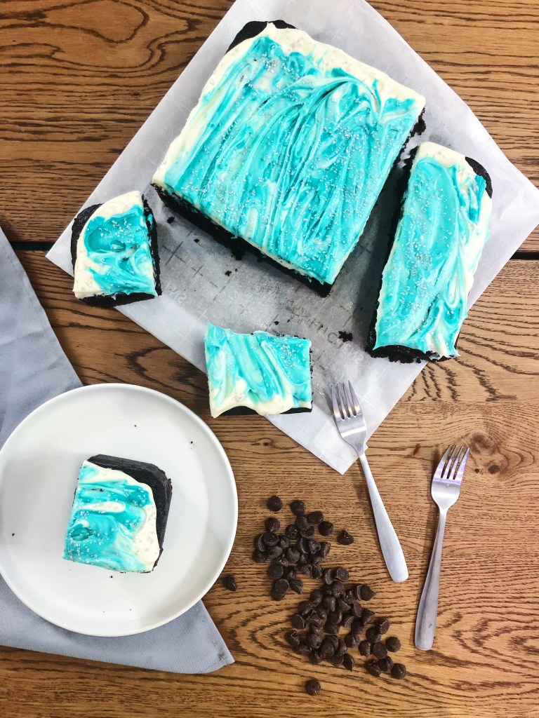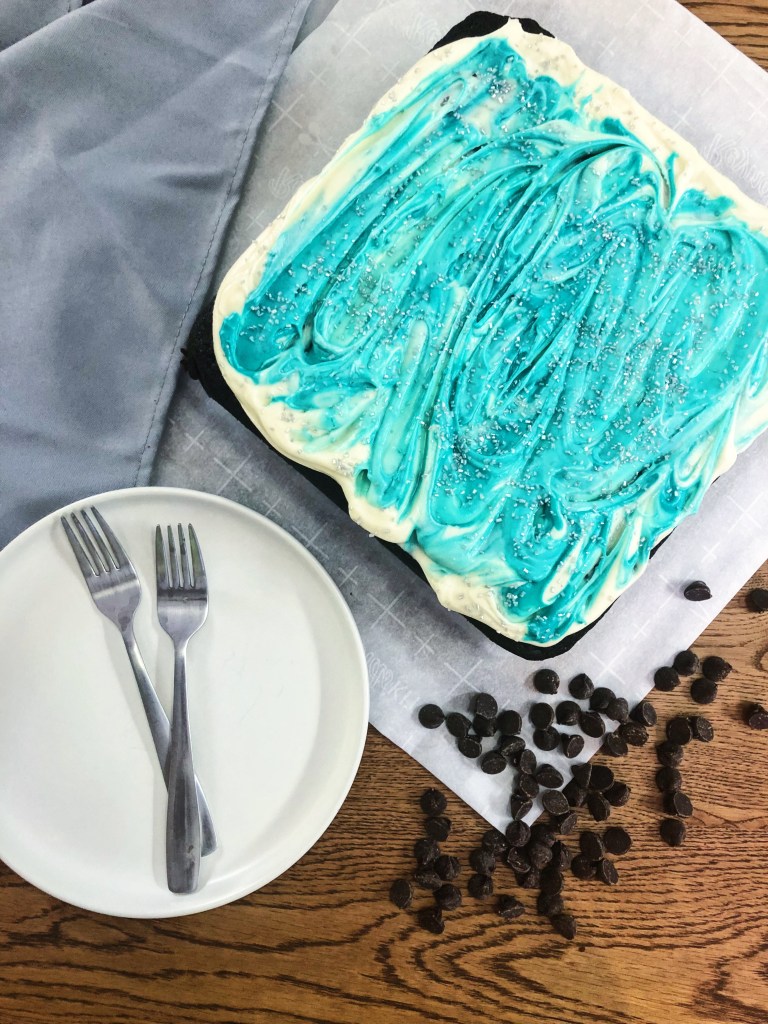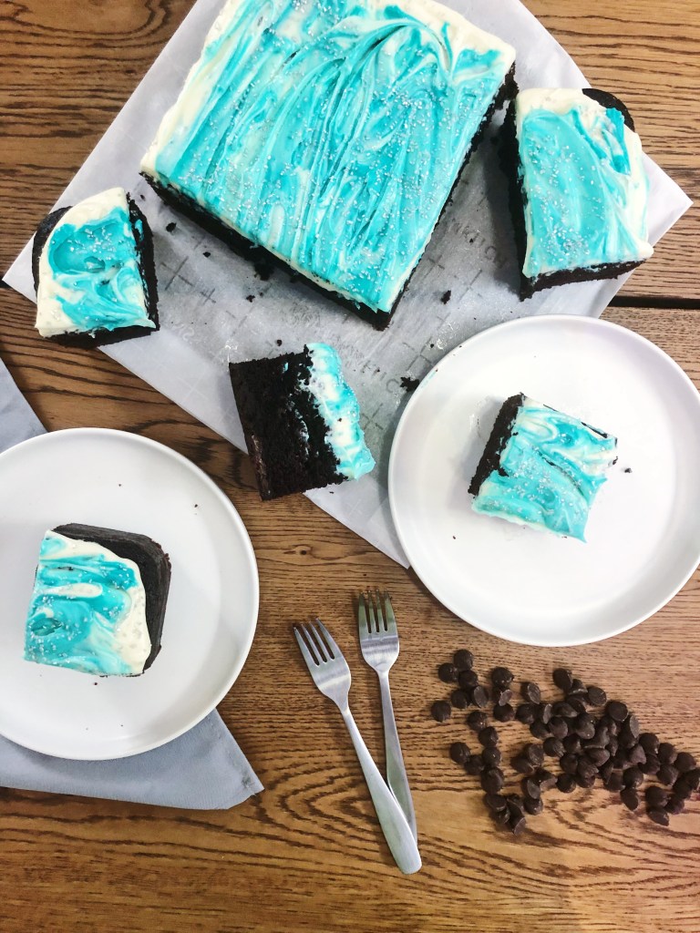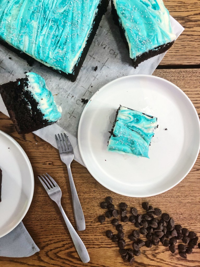Which is better, brownies or cake? Why choose when you can have a bit of both! Although this says chocolate cake recipe, it is kind of a cross between a dense, gooey brownie and a fluffy chocolate cake – best of both worlds! The bottom and outside has a delicious crunchy, gooey texture, like when you bite into a corner piece of a brownie. And the inside is fluffy and light like chocolate cake. It is loaded with chocolate chunks and chips for a chocolate explosion because there is no such thing as too much chocolate, right? It is also topped with a creamy cream cheese frosting that is not too sweet. I cannot get enough of this gooey, fudgy cake and how delicious and easy it is! You don’t even need an electric mixer for the batter – just a whisk and a little bit of elbow grease. If you are celebrating someone’s bday, need a dessert for a party, or just need a little pick me up after a long week, bake this cake for a tasty treat!