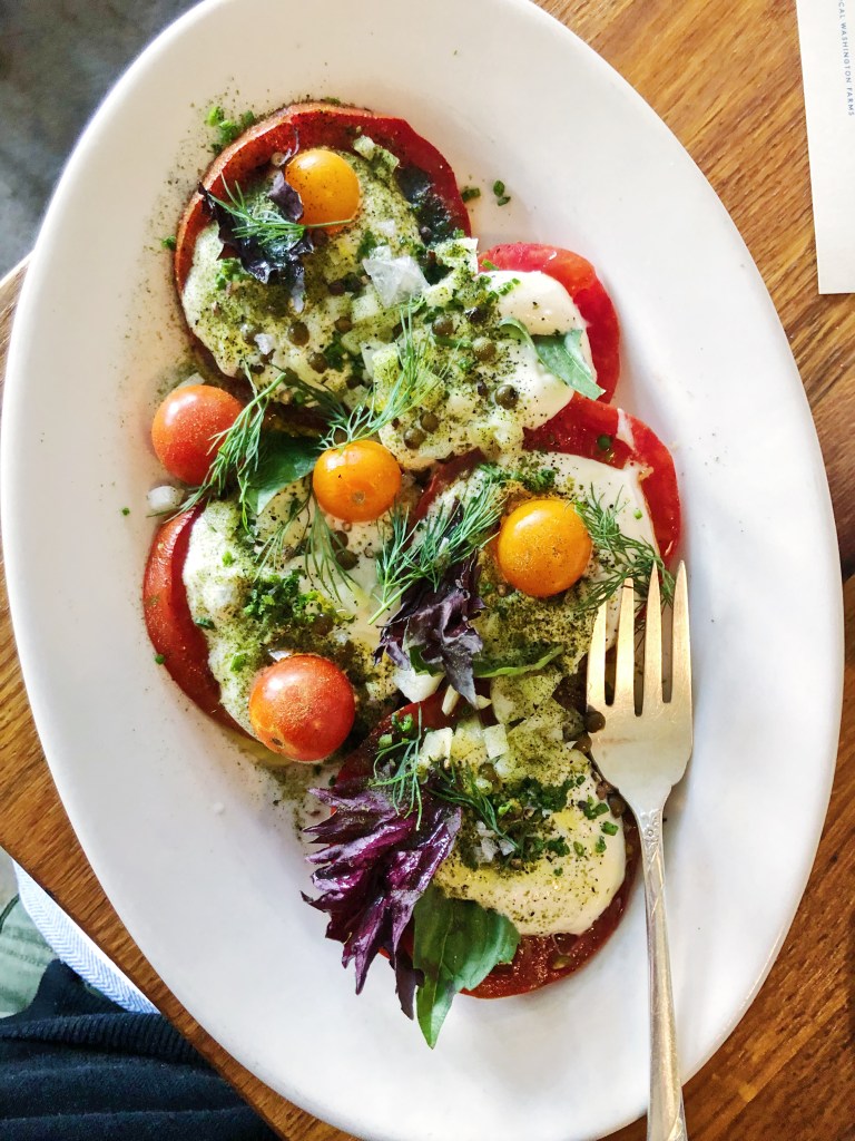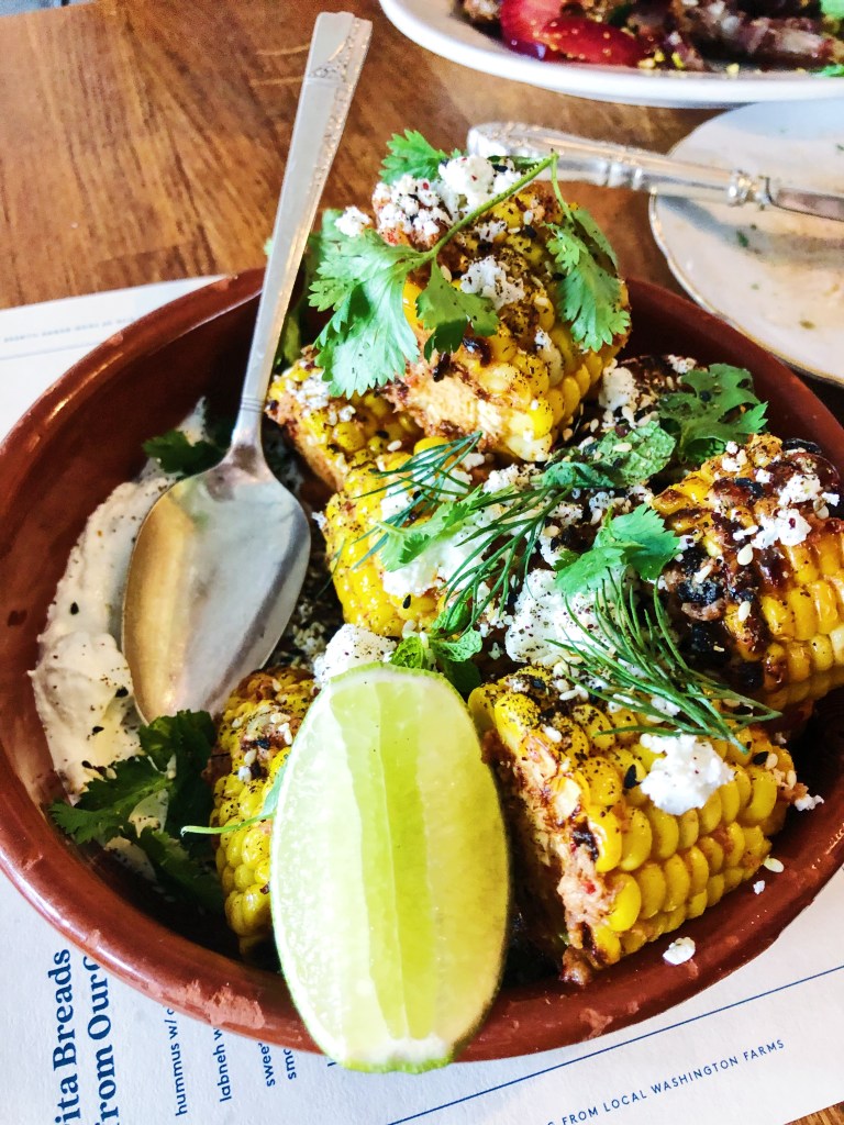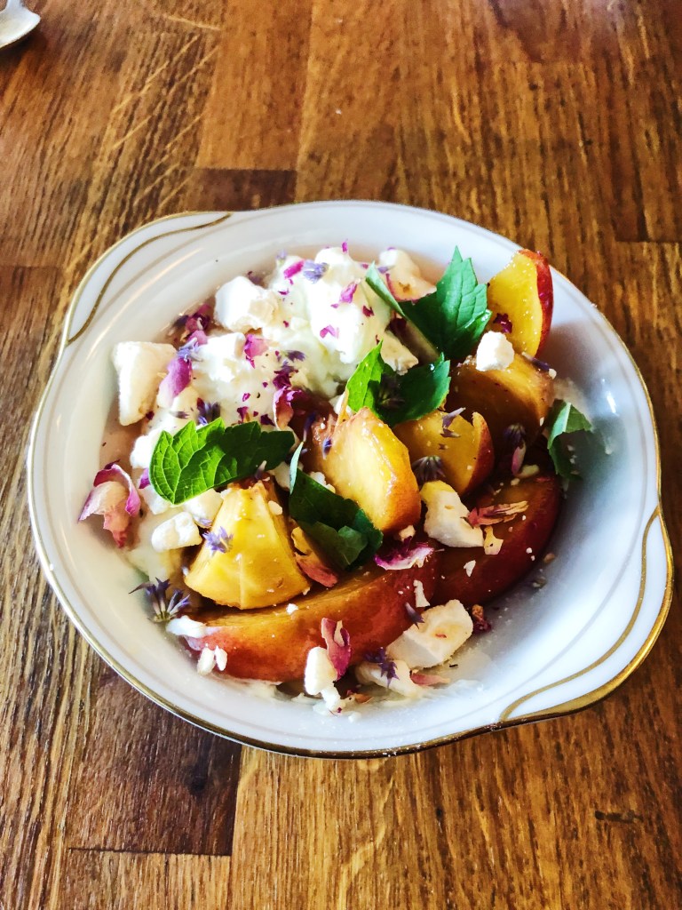 We started our meal with their sweet pepper dip served with fresh pita ($8). It was creamy, smokey, and nutty – I definitely recommend starting with one of their dips, I personally love any red pepper or sweet pepper dip because it is so flavorful! We then grabbed a few small plates as additions to our main dishes. We got the summer tomatoes with whipped garlic ($17) and summer corn ($12) – the summer corn is no longer on their menu, as they rotate their menu frequently for seasonality. Both were delicious – the whipped garlic on the tomatoes was incredible and I so want to learn to make it at home. While I loved the tomatoes, they were a bit pricey and as delicious as they were, I would say skip this dish because it wasn’t anything extraordinary. Their summer corn though was amazing and it is unfortunate that as I am writing this a few days after eating there, they no longer have it. It was grilled to perfection served with a creamy, tangy, salty yogurt sauce – but there are still plenty of delicious options you can choose from! For our main dishes we grabbed the grilled coho salmon ($23) and the lamb ribs ($21). The salmon came with a beautiful romesco sauce (see I told you I was a sucker for red pepper dips), roasted potatoes and nectarines. The salmon was cooked beautifully and the romesco sauce really made it pop! The lamb ribs came with plutos and pistachios and a thin-yogurt/tzatziki type sauce for dipping. The lamb was incredibly tender and fell right off the bone…yum! And, as if we didn’t have enough food in our bellies, we had to grab a dessert. They have soft serve, which I have heard is delicious but their rose scented peaches ($9) sounded a bit more intriguing to me. It comes with fresh peaches amongst a ricotta mousse, sprinkled with crunchy meringue bits.