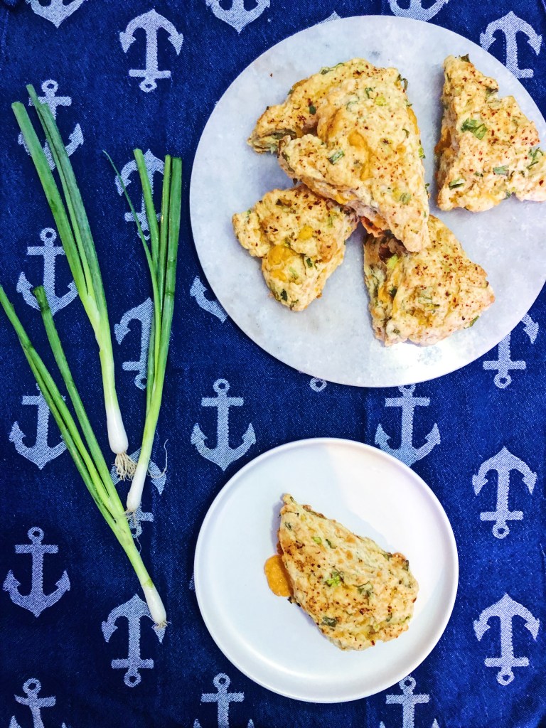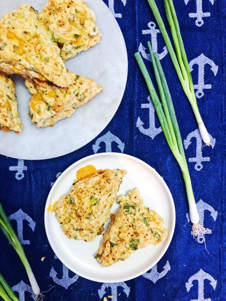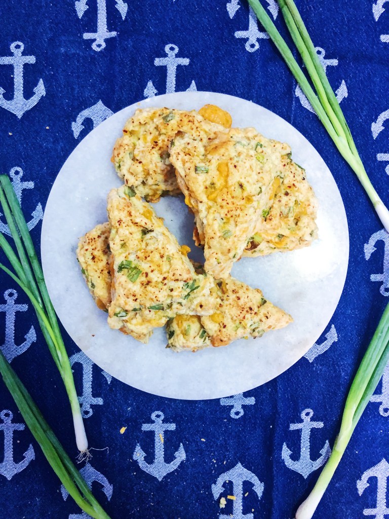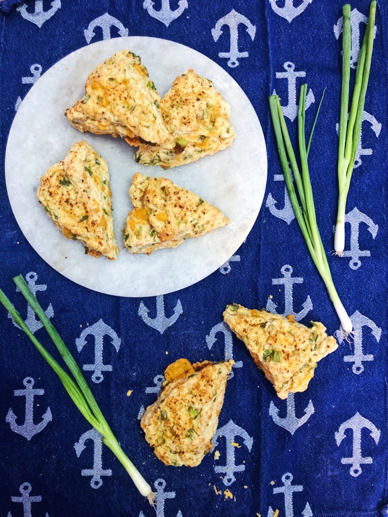 Your mornings are about to get a lot better with these savory scones. They are filled with green onions and cheddar cheese for a delicious breakfast or afternoon snack! Scones are actually much easier to make than I anticipated and really don’t require a lot of time or effort. I love savory breakfast dishes and these savory scones are literally so good! I recently had my first savory scone at a local bakery and they were so tasty I wanted to make some myself. I love the sharp cheese and onion combination in these flakey, warm scones that will have you reaching for more. Whip these up for your weekend or for an afternoon snack with friends!
