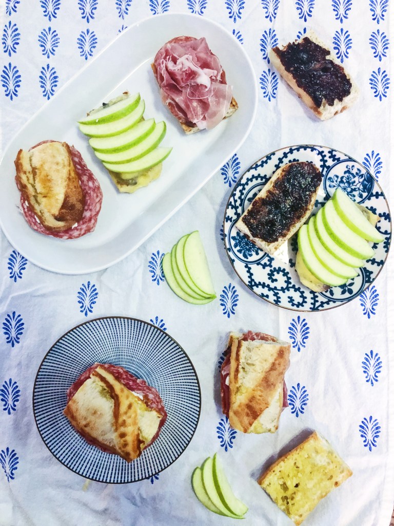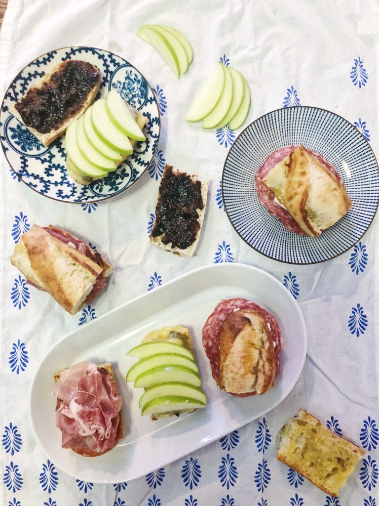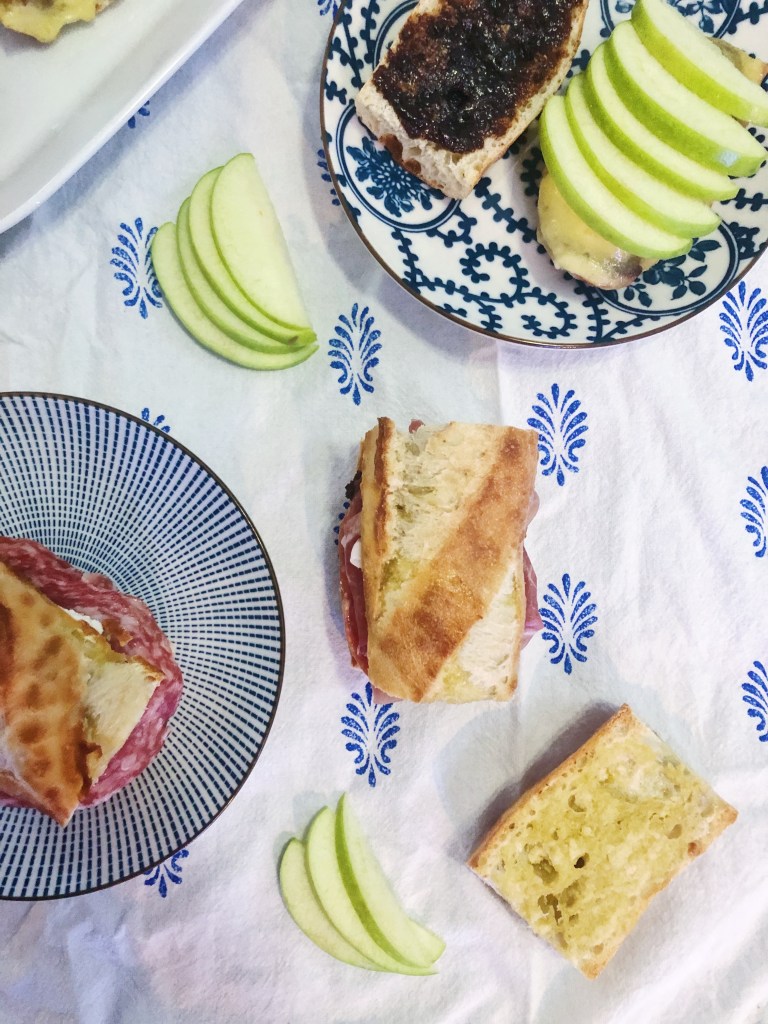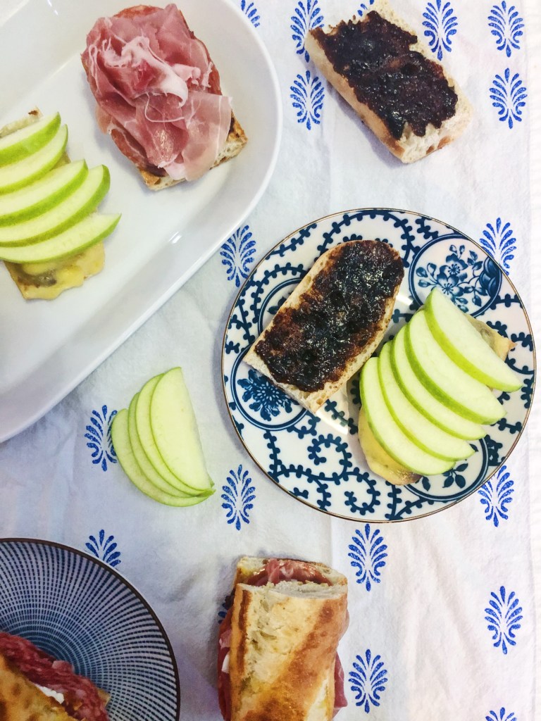 - Now time to assemble. Take the remaining two plain baguette pieces and spread 2 tbsp of fig jam on each of them. To finish this sandwich, top the brie with the thinly sliced apples and top with the fig jam baguette – set those aside.