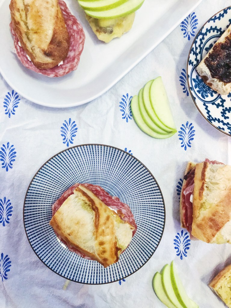 I was feeling a bit fancy the other day and wanted something that would allow me to pretend I was eating my way through Europe. It started because we grabbed breakfast at one of our favorite French bakeries in Seattle – La Parisienne. Everything is baked fresh and is like legit legit. Anyways, we grabbed a croissant, as always, but also grabbed one of their sandwiches. It was so simple but literally one of the best things I have eaten. It was a fresh baguette with salami, olive oil and greens – there may have been some sort of olive spread on there because there was an acidic, tangy flavor as well. I grabbed a baguette of my own, two different salamis and a few other ingredients and got to work! There are 3 different flavors here for some variety but all are so good. These are great for a crowd and sharing because you can make them in to smaller sandwiches and then eat them as a snack. You can also make one version as a full baguette! I love the flavor combinations here and they really do remind me of a picnic or walking the streets of Paris admiring all their cheese and bread. YUM! You may be hesitant to try the apple+fig+brie, but don’t skip it. It is a great combination – sweetness from the fig, salty from the brie, and crunch from the apple. It might be my favorite – but it is too hard to choose. Whip these up for an easy dinner or lunch – or wrap them up for a picnic and grab some friends or family and decide which one y’all like best!