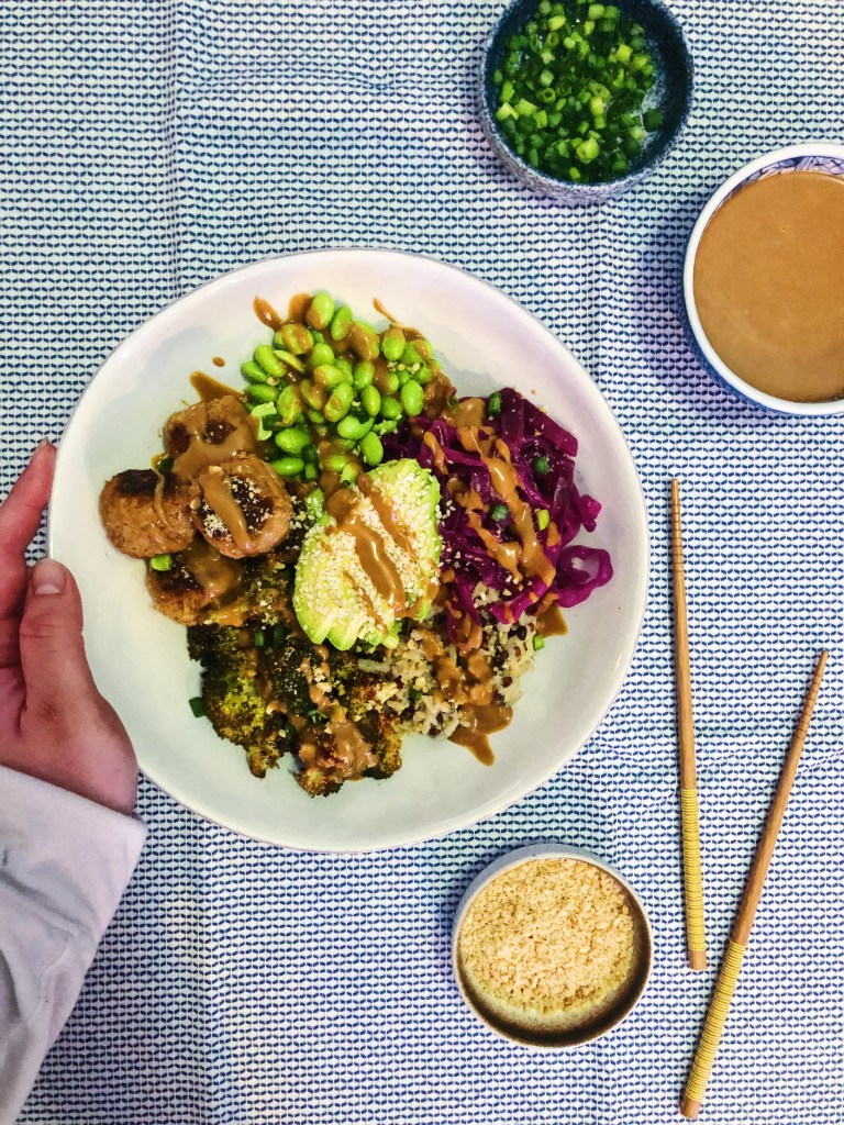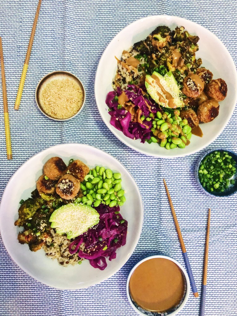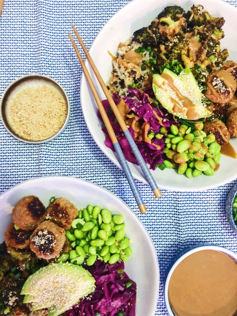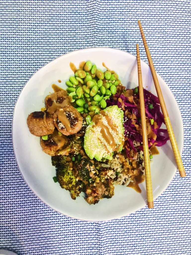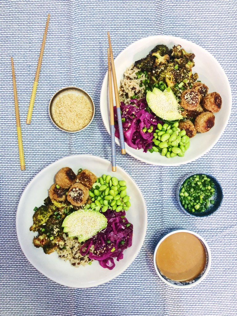 - Time to assemble the bowls! Add about 1/2 cup cook rice to each bowl. Top with 5-6 meatballs, ~1/2 cup of cabbage, ~1/2 cup broccoli, 1/4 cup edamame.