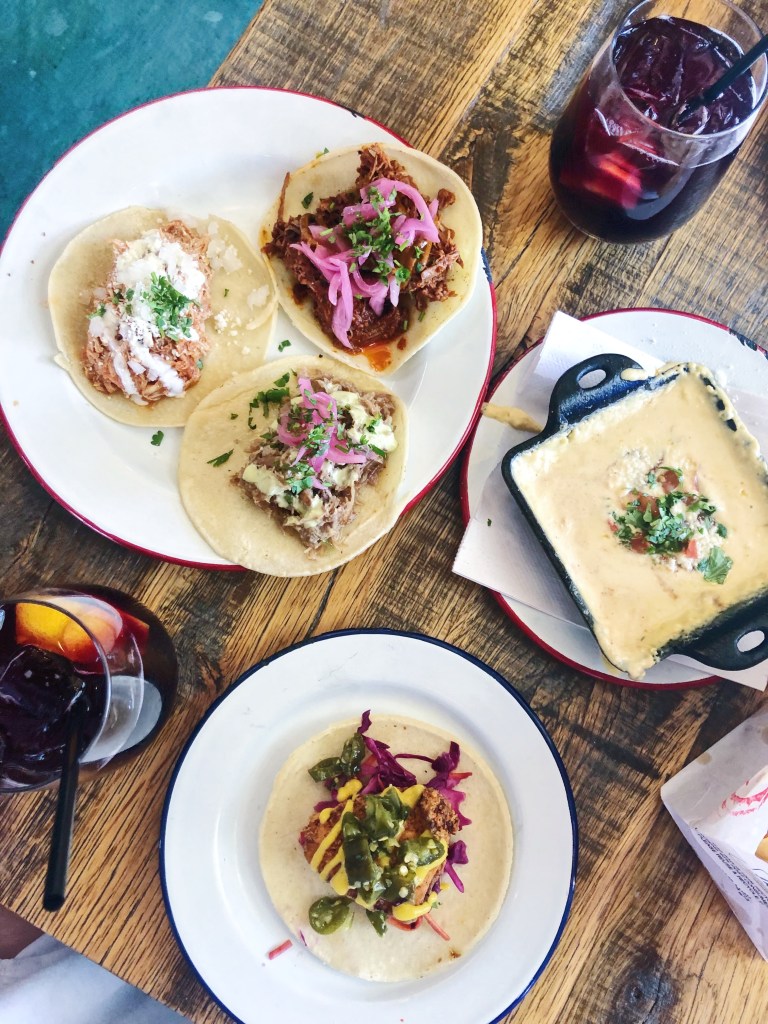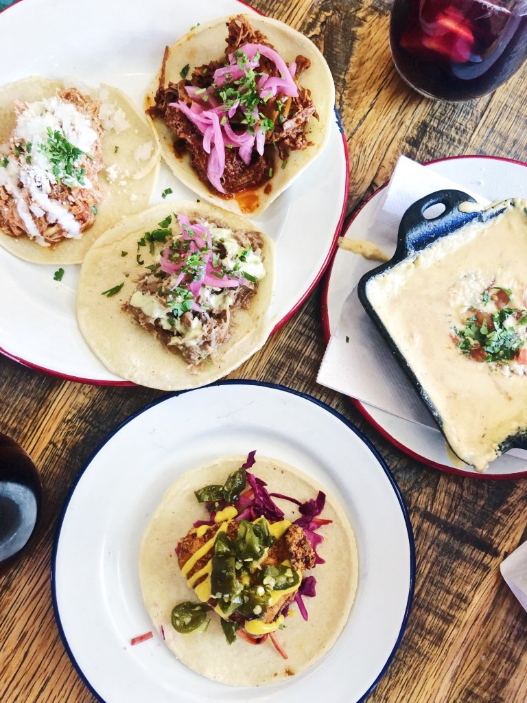 We ordered sangria and queso to start. DAMN their sangria was no joke – 1) it was incredibly strong for a tiny glass and 2) it tasted like it was straight out of Barcelona, no fake or overly sweet stuff here. AND at $5 you could easily be persuaded to down more than 1. Their queso came in a cute, square skillet topped with fresh pico and cilantro. Personally, it wasn’t the best queso I have had, but that is more of a style preference. It was thicker than most queso, but it did have an incredible taste. Slightly smokey, warm cheese paired with crispy chips – delicious. Now on to the main event, the tacos. Like I mentioned, they have a mix of classic and unique. I ordered the Funky Chicken and the Carnitas, while my friend ordered the Tinga and Barbacoa. We mostly ordered classic – but the funky chicken is a buttermilk fried chicken topped with slaw, serrano honey chiles, and drizzled with honey mustard. I was super impressed and I think it was my favorite taco of the bunch. The classic tacos were incredibly tender and juicy, but they almost lacked some flavor, maybe it was just becuase of the strong honey mustard and crispy chicken I had eaten 2 minutes before. They were still some delicious tacos and 10/10 would go again and again.