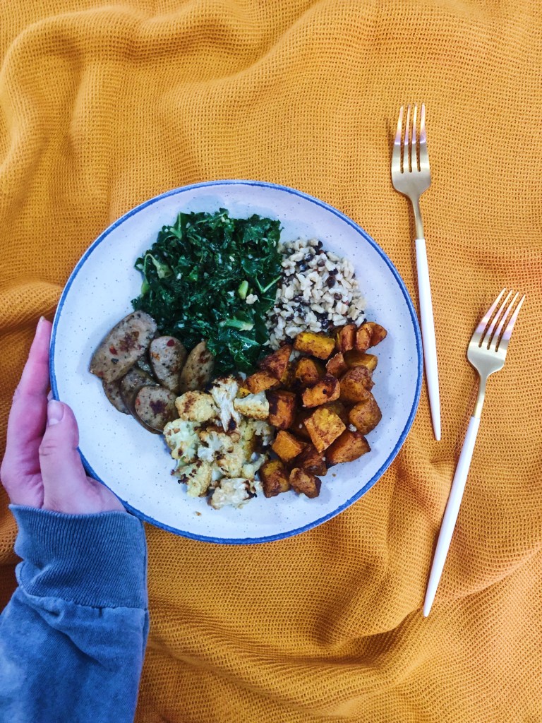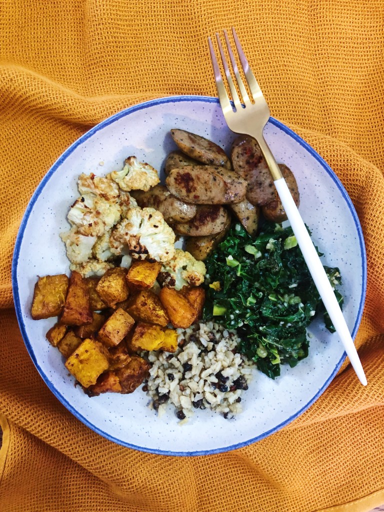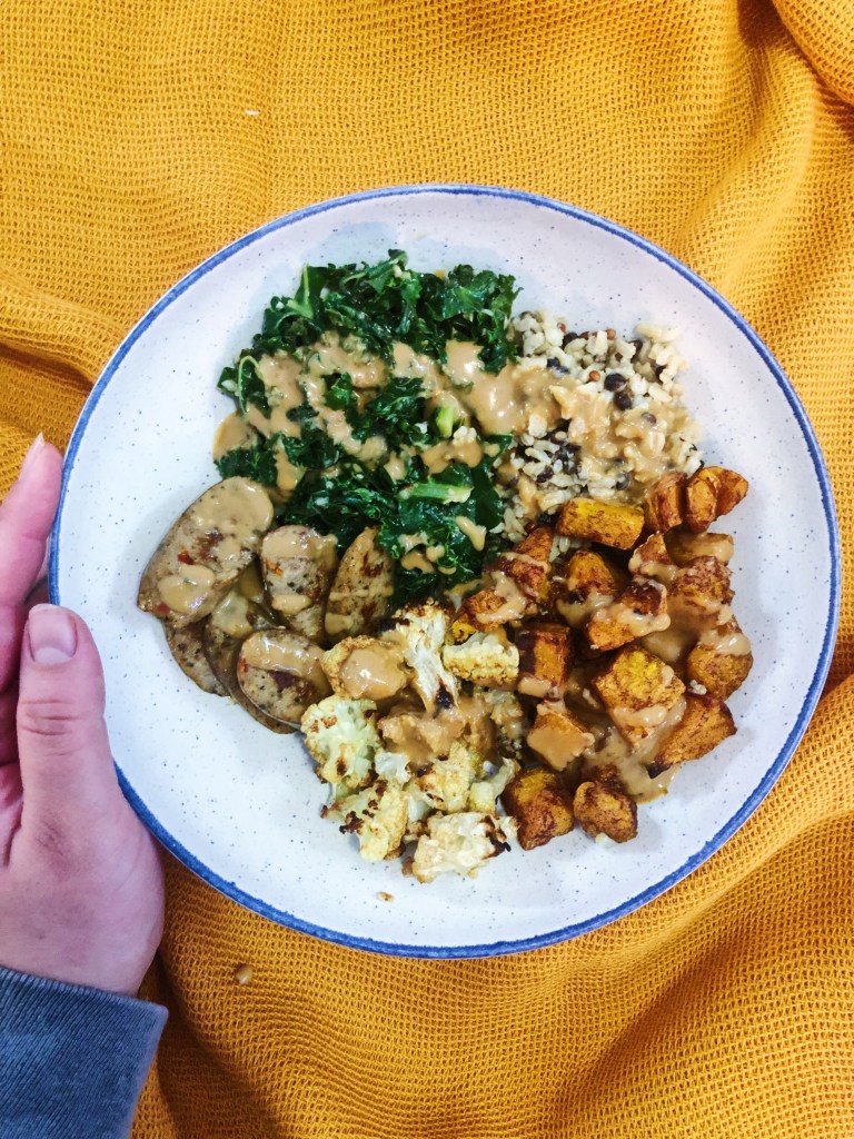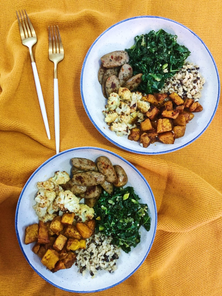 - Once everything is cooked, let’s assemble the bowls. Grab two bowls, add 1/2 of the kale, chicken sausage, cauliflower, butternut squash and rice to each of the bowls. Drizzle with the tahini sauce and serve!