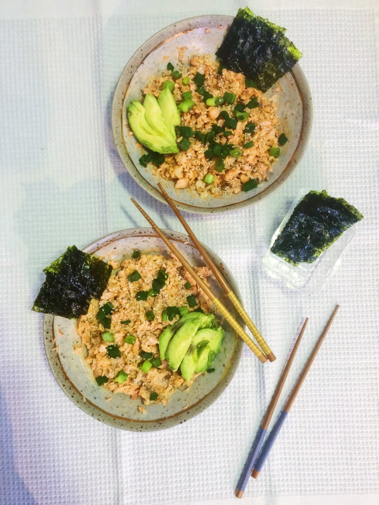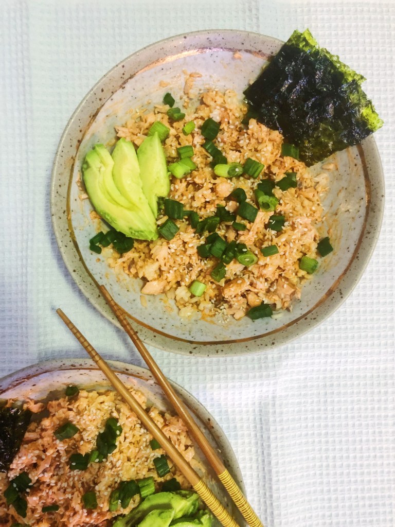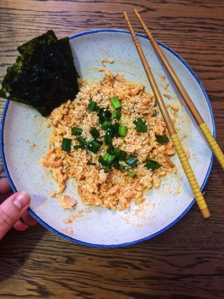 - Add 1/2 of the rice and 1/2 of the salmon to a bowl. Add in 2 tbsp sriracha and 2 tbsp of kewpie mayo. Using a fork, mash and mix the ingredients until well combined. *adjust the sriracha and mayo to your liking or if the mixture is dry add more.* Repeat this step for the 2nd bowl.
