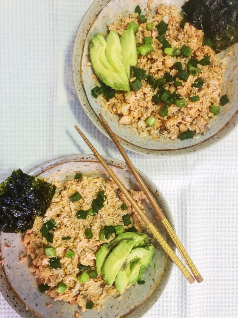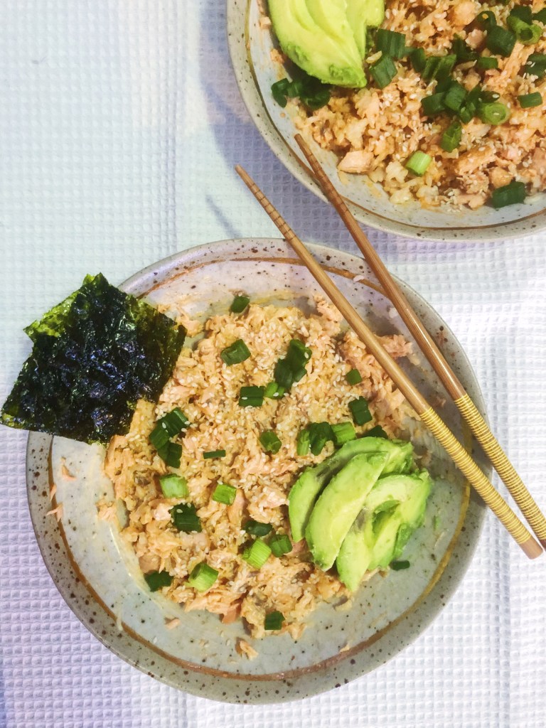 - FOr the perfect bite, place 1-2 tbsp of the salmon+rice mixture on top of the seaweed and top with some avocado and a small piece of pickled ginger and enjoy!