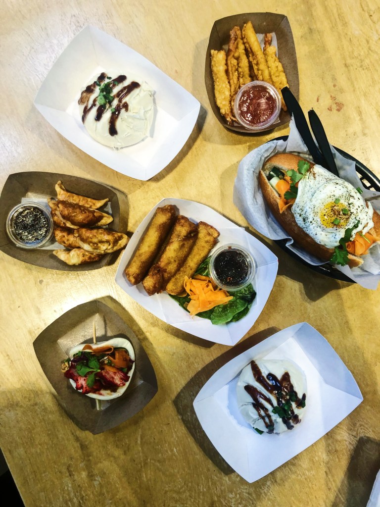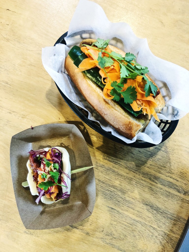 During my alone lunch (which honestly I am a huge fan of dining alone, especially when traveling – it is so freeing and it is a time for just me) I ordered a grilled chicken bao and a pork banh mi. The bao was light and fluffy, filled with juicy, glazed chicken and topped off with fresh and pickled vegetables. It was a flavor bite that was the perfect size – honestly I probably could have just grabbed two of these for lunch and it would have been enough. Now to the banh mi – oh my gosh, when they dropped it off at the table I was shocked at how large it was! It was like the size of my forearm and loaded with filling. Mine was filled with tender pork and then each banh mi comes with cucumber, jalapenos, cilantro and pickled carrots on a baguette. The crusty baguette paired with the warm meat and crunchy, cold, pickled vegetables is something of pure genius. Banh mis are some of my favorite sandwiches since they are the perfect balance of so many textures and flavors. If you have not had one before, definitely grab one ASAP and your world will be rocked! When I grabbed lunch with my parents, I of course had to try another banh mi, but this time I went with their chinese sausage and egg. We also ordered shrimp tempura, eggrolls, pork buns, gyoza (dumplings) and a sliced pork bao. Honestly, it was way too much and too much fried food – but that is what happens when I let my dad order! Their banh mi and baos are definitely the star of their menu. Their gyoza, shrimp tempura, and eggrolls were all very tasty and delectibly crispy. Next time I would have tried their vermicelli or rice bowl or their pho becuase I have a feeling if it is anything like their banh mis it would be absolutely phenomenal!
