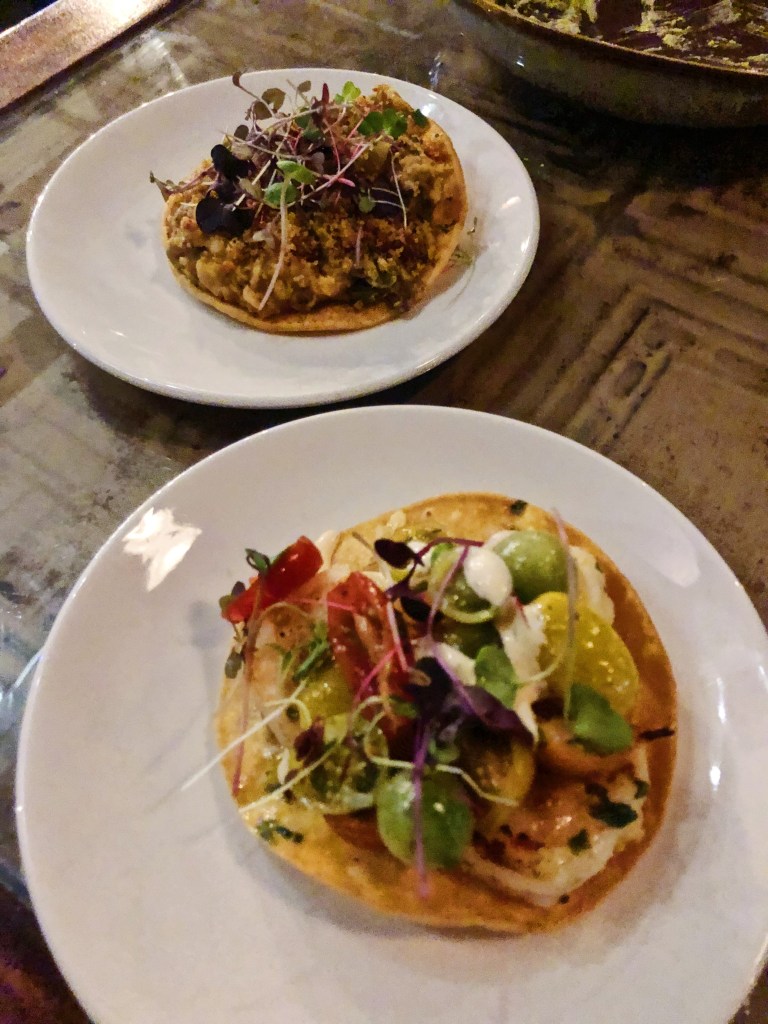 We grabbed the hummus and crispy eggplant to start. The hummus is served with warm pita, crudites, and stuffed grape leaves. A tasty combo that was a wonderful way to start off our meal. This was also the first thing I had eaten since breakfast since I spent the majority of the day in the airport and on a plane flying from Seattle to Denver, so I am sure anything would have tasted good at that point, but my friend went above and beyond to make my first meal in Denver a tasty one. The crispy eggplant is served with a large ball of burrata, atop a warm tomato sauce and drizzled with a parsley pesto. This was my absolute favorite plate. I mean I love burrata as always is a fan fav, but then add some delicately fried eggplant and a sauce – damn now you talking! I couldn’t resist trying the tostadas as well. I grabbed the shrimp tostada that came with a freshly wood-fired tostada, succulent shrimp, chipotle cream and cherry tomatoes. Incredible!