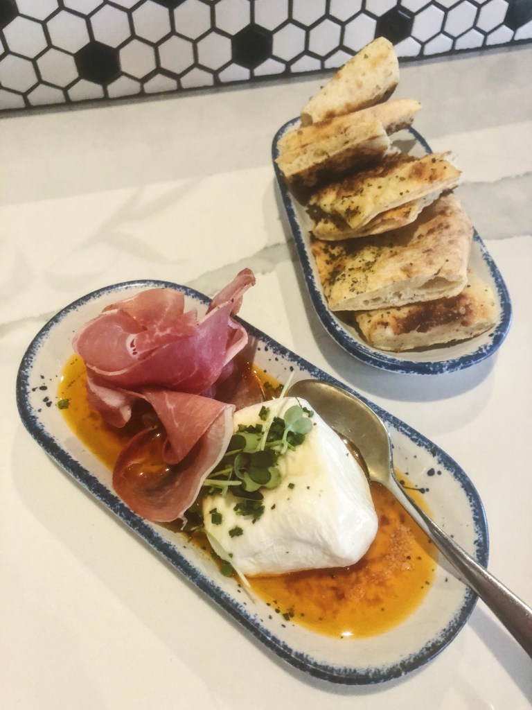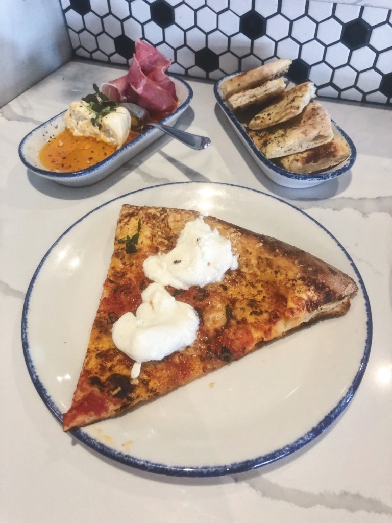 One of the best deals on their menu? Their lunch special. You get an individual appetizer (you can choose between quinn’s burrata or the uncle rico) + salad of choice + slice of pizza for the price of $15. Honestly it is a seriously great deal. It is so much food and such a low price and you get a little but of everything. The Quinn’s burrata is one of the most popular appetizers and is as the name suggests, burrata, with truffle honey, prosciutto, and calabrese oil served with their wood fired flat bread. The Uncle Rico was just as tasty and is ricotta with burnt honey, sea salt + pepper and served with flat bread. They also have garlic knots, bruschetta, bacon jam