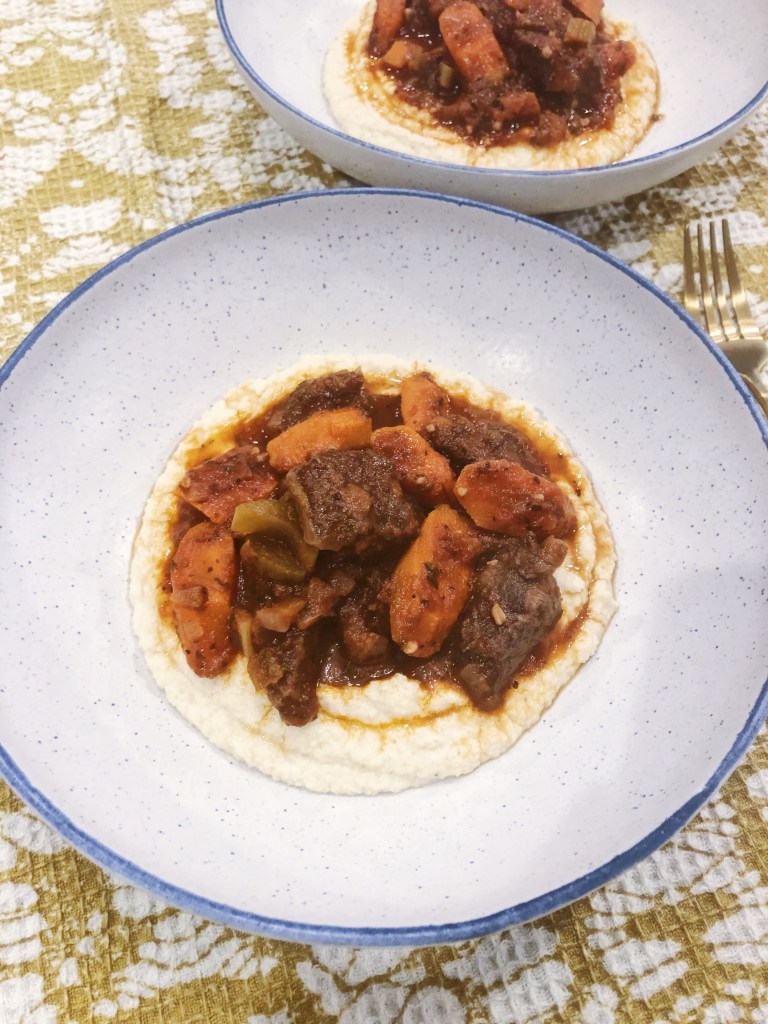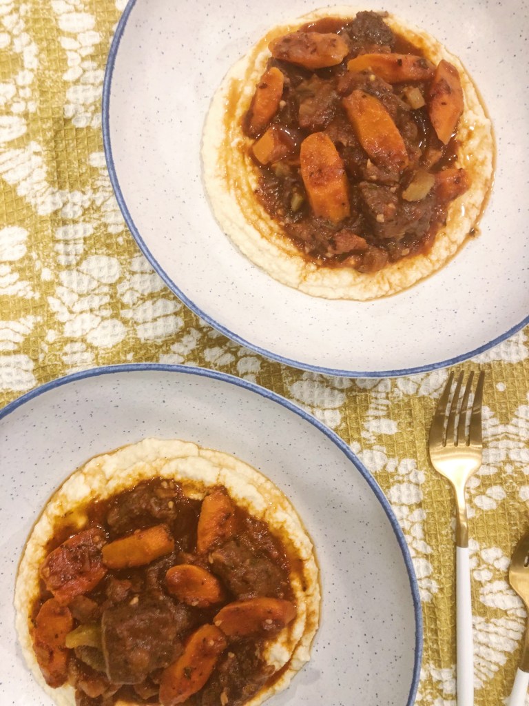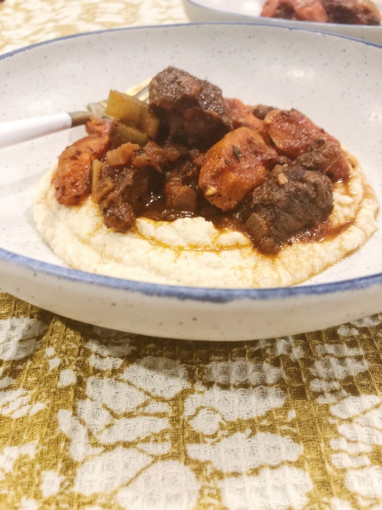 1. When the roast and cauliflower are ready to go, divide the cauliflower mash between bowls. Using a spoon, make a little well in the center of the mash and top with the stew!