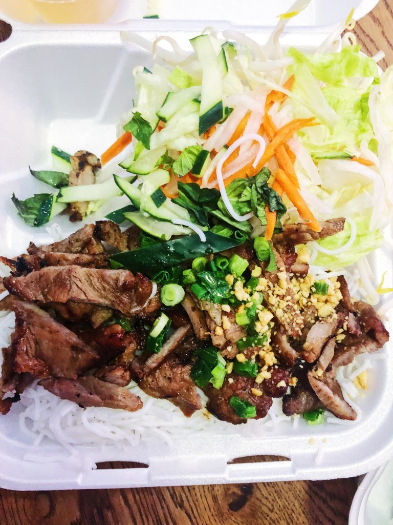 Viet’s Phoody is a brand new vietnamese restaurant that opened in October 2021 between Kent and Renton. We found them on DoorDash and decided to try them out. We love vietnamese food and area always looking for close, tasty options! I had passed this place a few times on the way to the gym and knew we needed to check it out. To start, we ordered fresh spring rolls with chicken. These come packed full of chicken, lettuce, bean sprouts, and noodles, all wrapped up in rice paper and served with peanut sauce. These were a great way to start out the meal and were fresh, tasty, and huge! 1 ordered was enough for the two of us to share! The peanut sauce was incredible – was well balanced between the nutty peanuts and a slight acidic taste (presumably from some rice vinegar)..I only wish it came with more sauce because it was so tasty, I could have eaten it by itself with a spoon! I loved the grilled chicken in the spring roll – I normally go with shrimp because of lack of options, so I really enjoyed that chicken was an option here! For out main dishes we ordered grilled pork vermicelli bowl (V1) and the chicken, shrimp and egg roll vermicelli bowl (V4). All of their bowls come with vermicelli noodles, bean sprouts, pickled carrots, crushed peanuts and fish sauce. My only critique is I wish there was more pickled carrots because they are my absolute favorite – crunchy and tangy and are the perfect combination with the warm meat. There was so much food that you can definitely share a plate or save some for lunch the next day. The portions were huge for the price which was awesome! They have so many options on their menu – banh mi, rice bowls, pho, and a number of specials! I can’t wait to try their banh mi and pho next time.