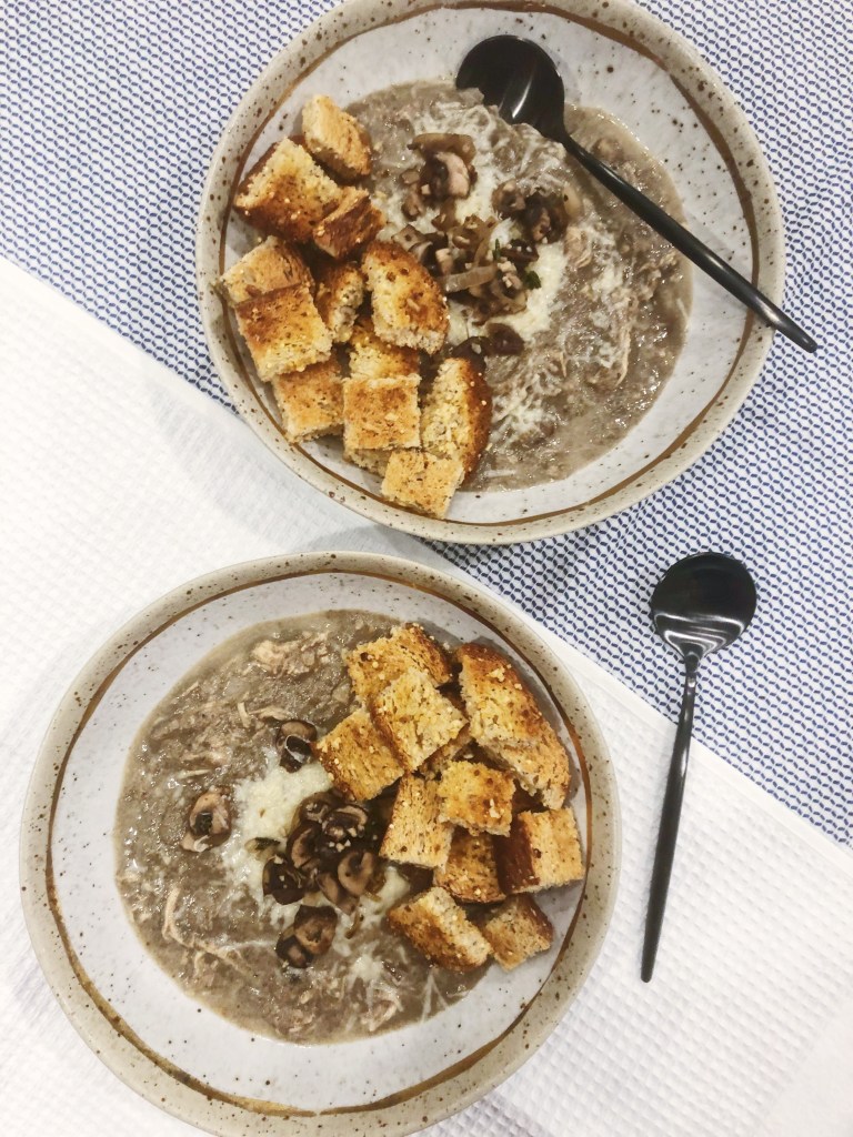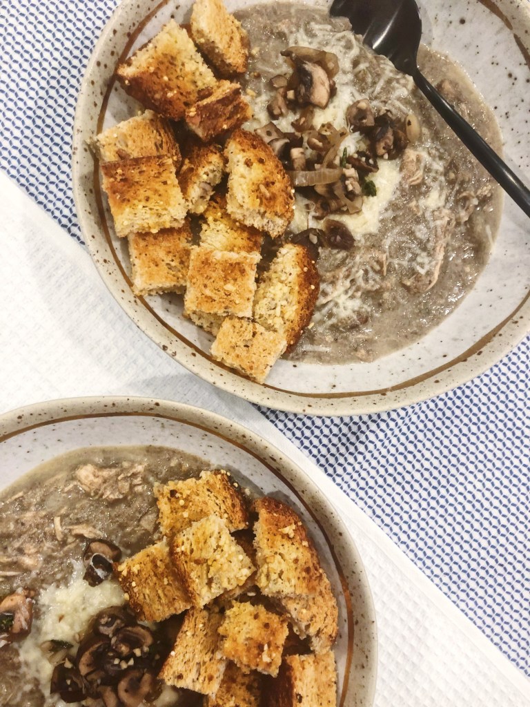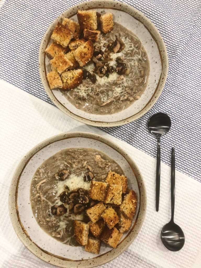 Soup season is in full swing in my house and I have so many delicious soups that are so easy! This one features mushrooms and is full of flavor. I used a variety of mushrooms to really draw out the taste. This soup is thick, rich and hearty – think of cream of mushroom but thicker and way more delicious. This recipe could also be 100% vegetarian if you omit the chicken and also swap the chicken stock for vegetable stock instead. For convenience, I used a rotisserie chicken but you could also cook chicken breast or thigh in the soup while it cooks.