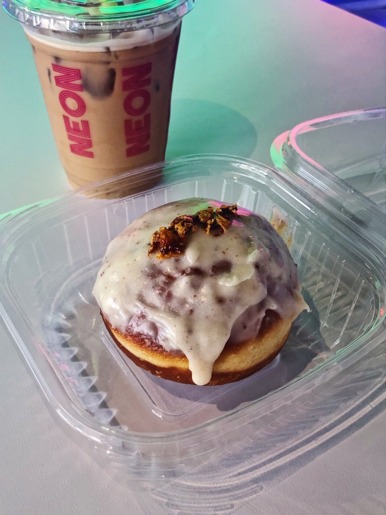 Their menu has some crazy creations as well as classic coffees and food! They’ve got a Blackberry, Peanut Butter Bomb, and Tiramisu, but you can also grab a Cappuccino, Latte, or Drip if you want something a little less wild. I grabbed their Magnificent Chai, which is one of their most popular drinks. It is espresso with milk and housemade chai syrup. I got mine iced with oatmilk, classic move on my part (I love the flavor of oatmilk more than regular milk). It was the perfect afternoon pick me up that I didn’t know I needed until a took my first sip! It was just sweet enough, but not overpowering and I was still able to taste the espresso, which for me is the goal. I also grabbed a donut because it kind of just felt like the right thing to do. Their pastry case was empty, but make sure to ask them because they still had plenty left! You can choose from butterfinger, matcha yuzu, honey roasted peach, vanilla or chocolate. I went with the honey roasted peach, but it was a tough decision between the matcha yuzu. The flavors of the donut were incredibly tasty, but it was a bit too doughy for me – I think it there was more filling it would have been better balanced. I also just prefer more filling than not. Don’t give me a half filled donut or I will not be happy about it. They do also have salads, sandwiches, and a few breakfast items if you are wanting something savory and more sustainable than a donut.