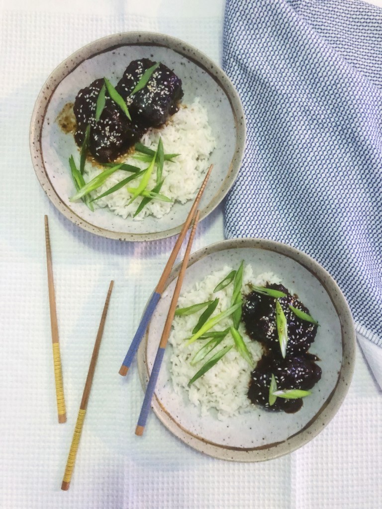 - After the sauce has thickened, it is time to serve. Take each short rib and dunk it in the sauce and swirl around to coat it. If you are serving with rice, add 1-2 short ribs on top of the rice and drizzle with the remaining sauce. Lastly, sprinkle with sesame seeds and green onions (optional) and serve!