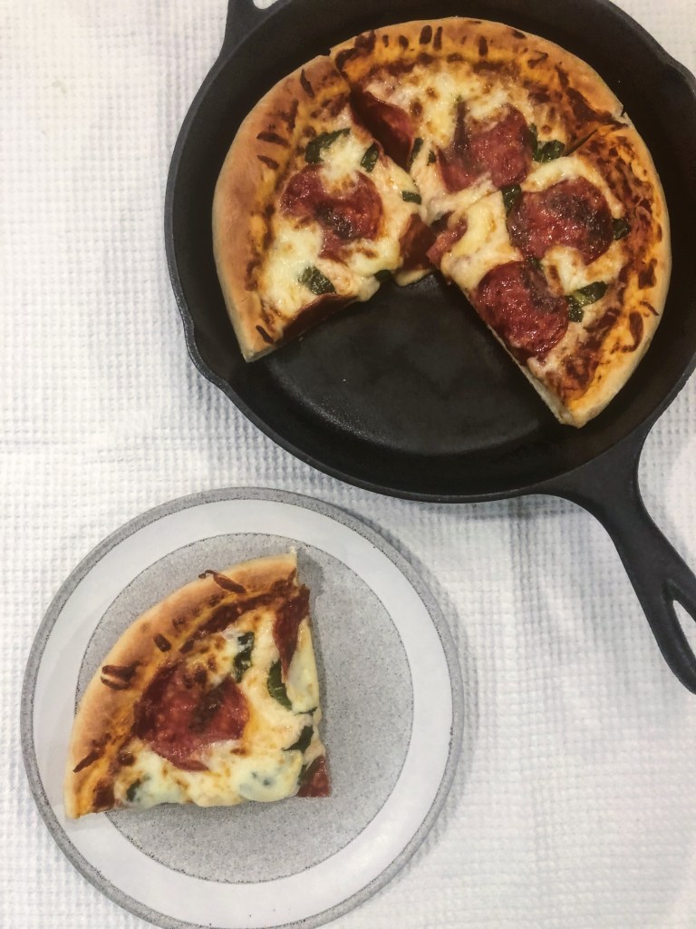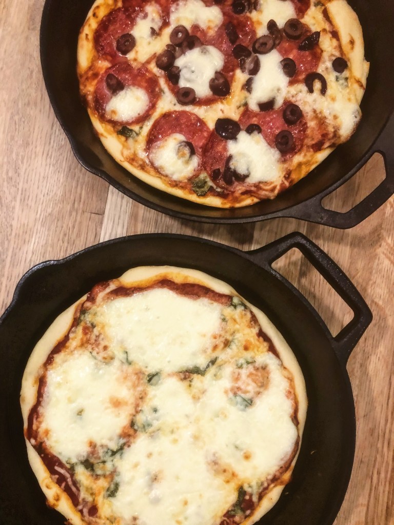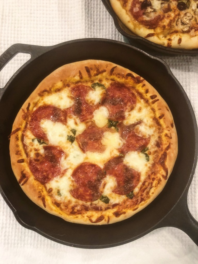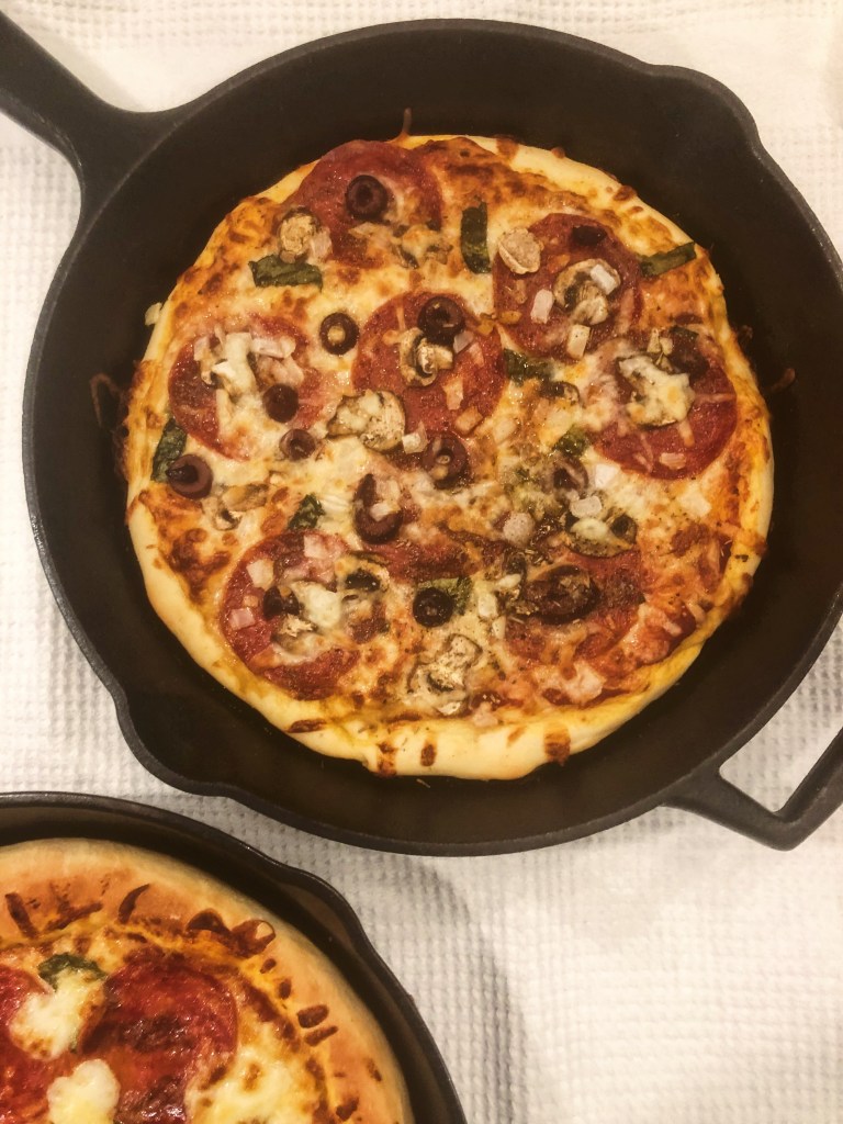 Pizza is always a good idea and this cast iron pizza is an even better idea. Making pizza has never been easier or more delicious and it can be a fun activity for the entire family. The cast iron helps get the crust nice and crispy without burning it. This pizza is probably some of the best I have ever made at home and I don’t think I will ever cook pizza another way. You can save some time on this recipe by using a pre-made dough from the grocery store, but I can’t guarantee it will come out as good. The dough here is so easy to make, it just requires some patience to allow it to rest and rise, but it is so worth it! Pizza night is always a fun night in our house – we get a ton of different toppings and let everyone make their own pizza so it is exactly what they want. The only inconvenience of this recipe is that most people probably don’t have multiple cast iron skillets, so it make require some extra time to cook all the pizzas – if you don’t have a cast iron at all, I highly recommend investing in at least one. They are a superior kitchen item because you can do so much with them. If you aren’t familiar with cast iron, make sure to do a bit of research on cleaning and taking care of it since you typically shouldn’t wash with soap (sometime ya just have to though if the dish just won’t come off). Anyways, make this for your next pizza night and you won’t go back to take out ever again.