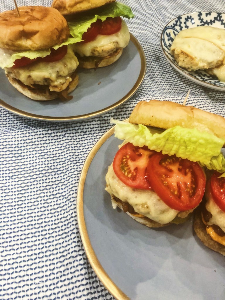 - When you have all the toppings ready, it is time to cook the burgers. Heat a large pan over medium heat and add 1 tbsp olive oil. Once the pan is hot, add in a layer of chicken patties (make sure you are not overcrowding the pan). Cook for 6 minutes then flip the burgers, reduce the heat to low, add a slice of cheese on top of each patty, cover and continue cooking for another 8 minutes.