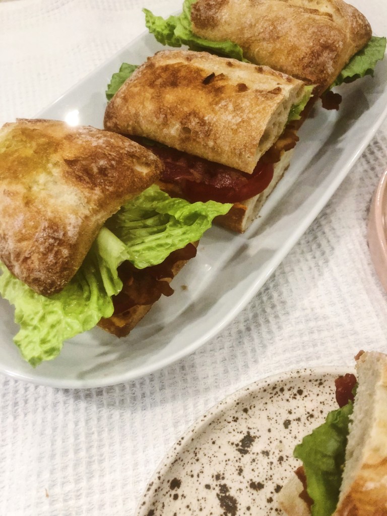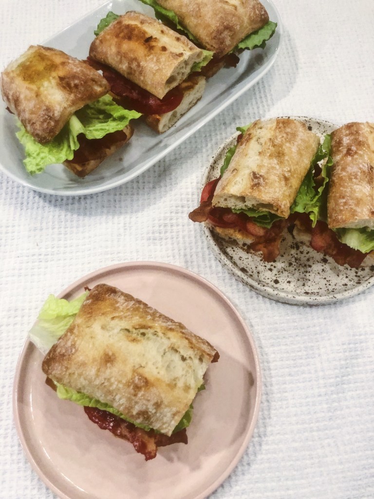 I know most of you probably know how to make a BLT and are familiar with what they are. But I wanted to post a delicious BLT recipe that will have you ditching what you grew up on. BLT – nothing is more classic than bacon, lettuce and tomato on white bread slathered with some mayonnaise. I am not here to make some crazy or gourmet BLT or even try to change the core of it – I am looking at you BLAT (bacon, lettuce, avocado, and tomato). But this one is a bit more pizzazz. I swap the white bread for a crusty ciabatta slathered in minced garlic and toasted first. Then I swap the basic mayonnaise for a spicy harissa mayonnaise that I found at Whole Foods. It adds a hint of spice, but so much more richness and flavor depth. Everything else remains the same – crispy bacon, fresh tomatoes, and crunchy lettuce to top if off with. Honestly BLTs are the most underrated and under appreciated sandwich of all time. THey are so simple but the combination is outstanding and makes it one of my favorite sandwiches. Now what I will say, is if you go out do not order a BLT – they are too easy to make at home to pay that much at a diner. Save your money and order that fancy or harder to make sandwich. But don’t forget the humble BLT for your lunch!