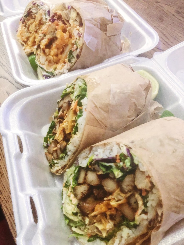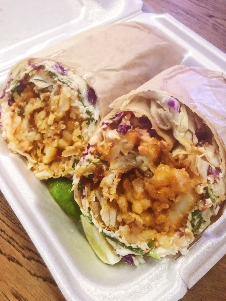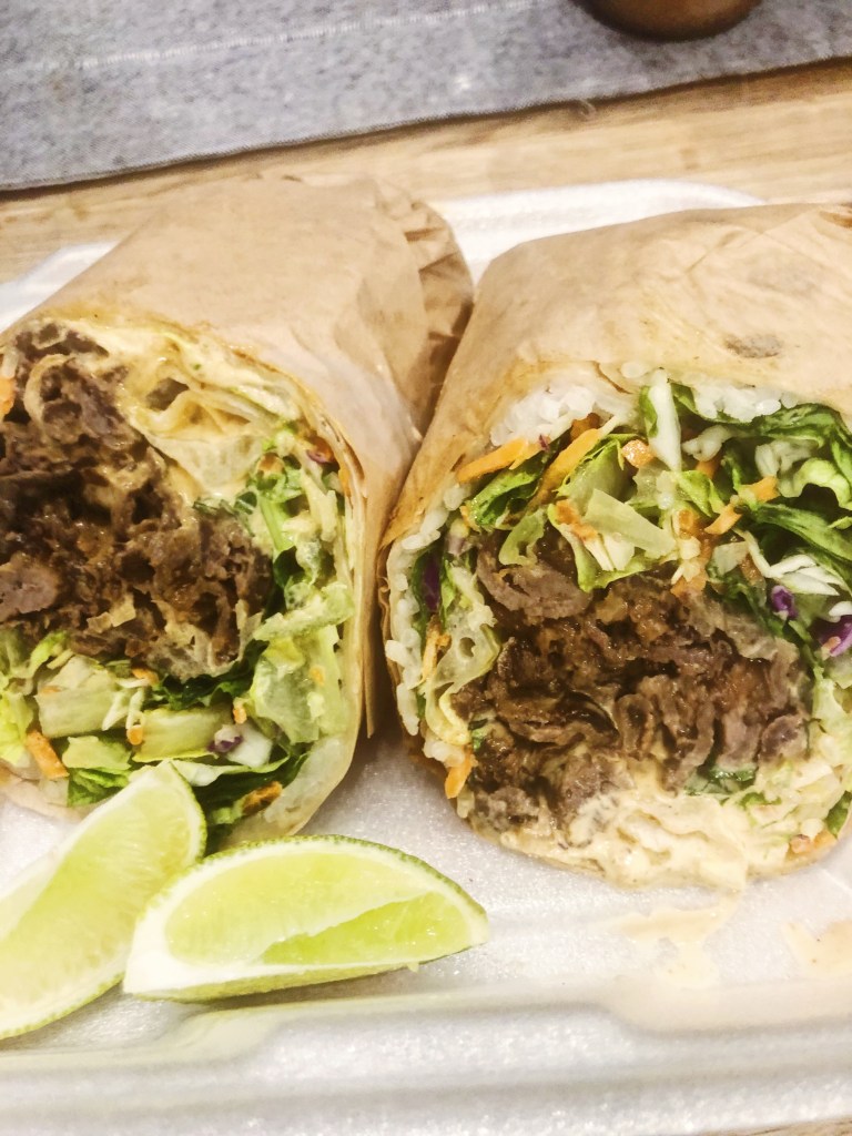 So far, I’ve tried 3 of their burritos – the Bulgorrito, Huli-Huli, and the Kraken. The bulgoritto is my favorite currently and is filled with bulgogi, cabbage mix, chile lime dressing and spicy mayo. It is then wrapped in a thin layer of rice and then a tortilla! It was better than I could have predicted. Soft, tender meat with the crunchy slaw and a bit of heat from the spicy mayo – the fresh squeeze of lime juice really set it off and added just enough acid to cut through all the carbs! The Huli-Huli is perfect for chicken lovers – stuffed with grilled chicken, chicken dumplings, huli-huli sauce, cabbage mix and spicy mayo. This one was good, but I felt it was a bit dry and lacking in sauce and flavor. The chicken was almost a touch overcooked, so on it’s own it didn’t really do it for me. I would still eat it, but maybe ask for a side of extra sauce to dunk it in. Lastly, the Kraken – if you love fish, this is the burrito for you. It is full of fried cod and calamari, crab mix, french fries, cabbage mix, chile lime dressing and spicy mayo. Surprisingly this one was actually light and refreshing. The cabbage mix and chile lime dressing really help cut all the grease and heaviness of the fried foods and the crab mix adds a nice, refreshing bite. The crab mix is what you see in a lot of sushi rolls so I definitely loved that! I am not a huge fish lover, so for me I wouldn’t get this flavor again, but it was fun to try. Next on my list to try is their Locosoba – it is yakisoba noodles with bbq pork!