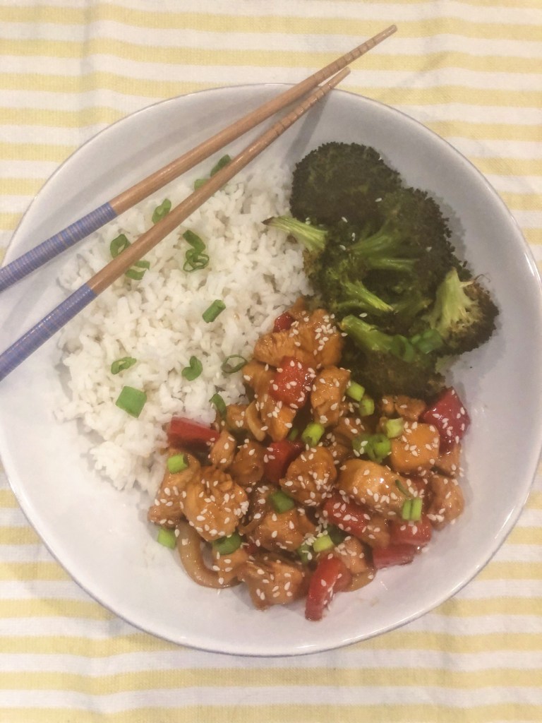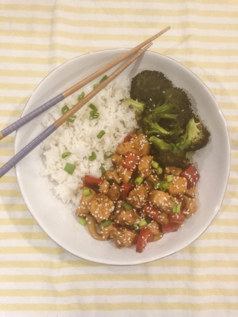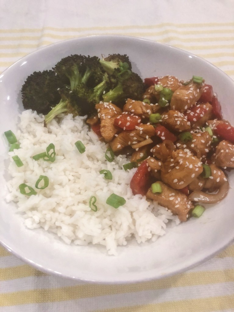 - Divide the chicken between 4 bowls and top with sesame seeds and green onions. Serve alongside rice and your favorite veggie, if desired!