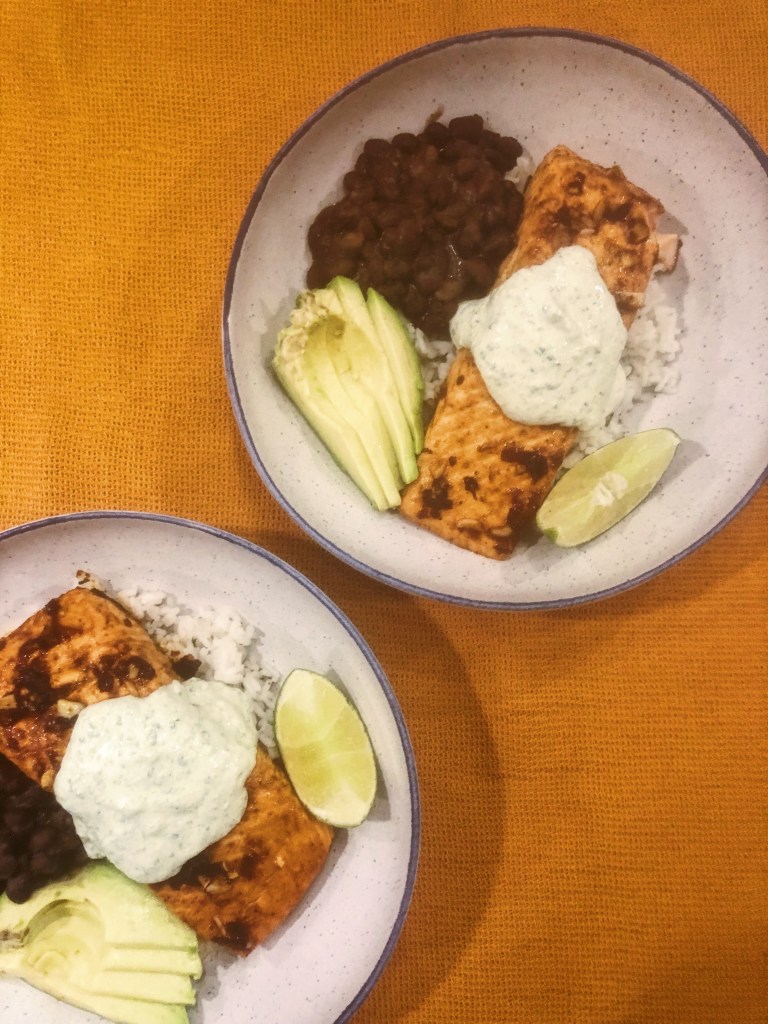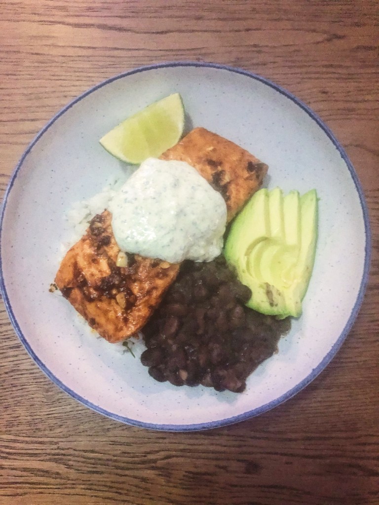 Tangy, spicy and creamy – oh my! This is what you’ll get from this dish. A perfect balance of smokiness, acidity and heat that will have you wanting to eat this everyday. Salmon is a great fish that isn’t too fishy, but still has a nice, mild flavor. This dish is inspired by a burrito bowl featuring cilantro-lime rice, black beans, fresh avocado, chipotle salmon and a delicious, creamy lime sauce. My favorite part of this dish is honestly the lime sauce – it is roasted jalapenos blended with sour cream, cilantro and of course lime juice! It has a wonderful flavor and will give you a tang of lime juice and wonderful smoky notes that blend together for an incredible sauce. I could eat this by the spoonful and put it on everything!