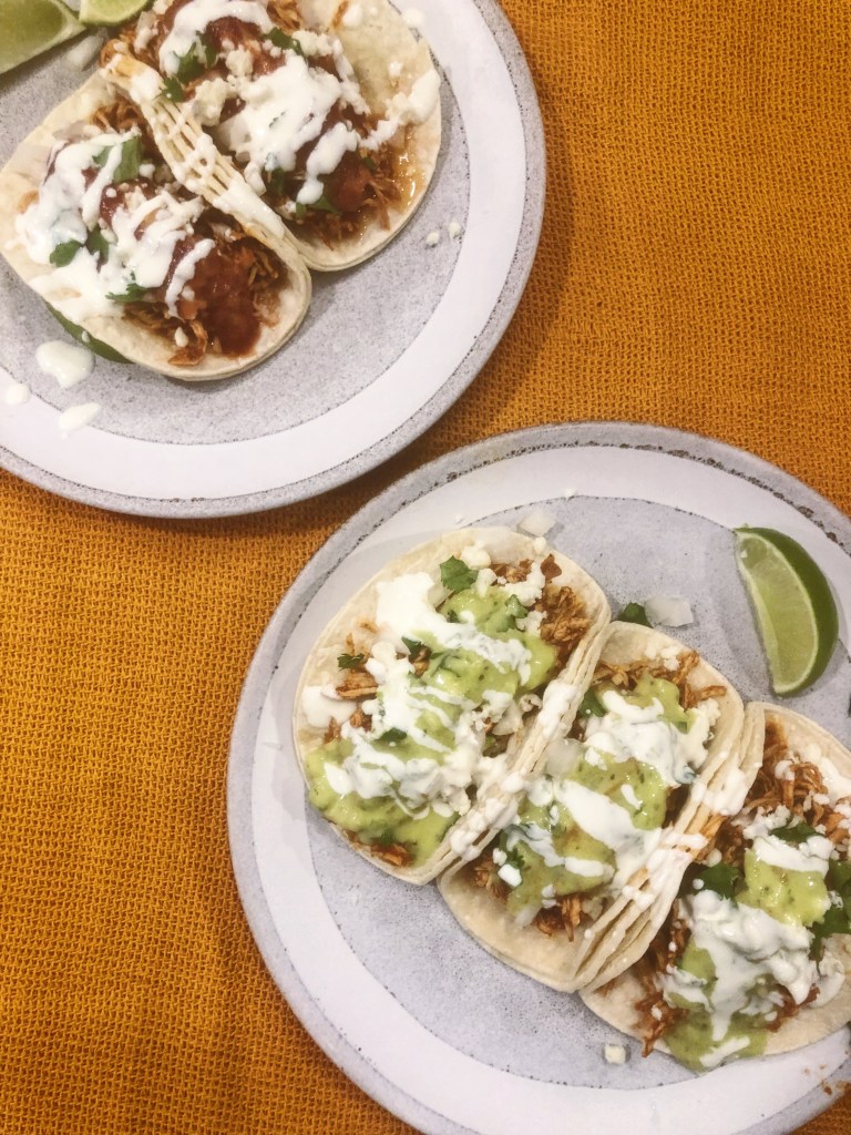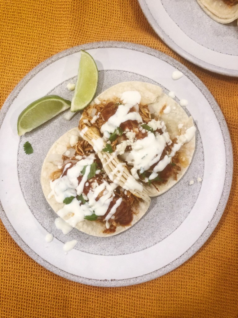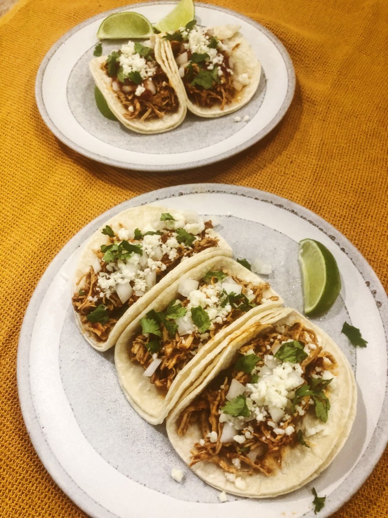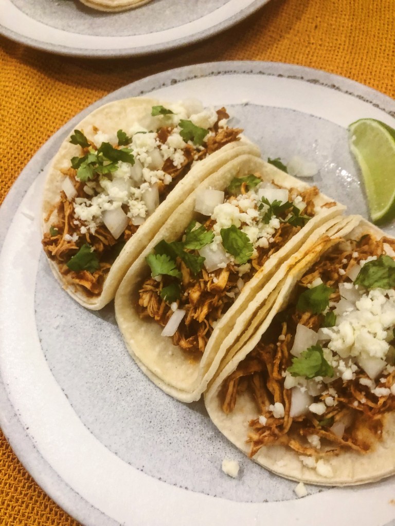 I recently categorized all my recipes and for how much I talk about my love of tacos, I surprisingly don’t actually have many taco recipes. I need to step my taco game up this year and bring y’all more tasty taco recipes! Here is a great one that I actually make a ton, but realized I have never shared – this is one of my go-to, easy weeknight recipes. I use the instantpot for this recipe so it goes even quicker and produces a tender, juicy, fall apart chicken. You can make this in a slow cooker or on the stove top, but it will take extra time to ensure the chicken comes out moist. I like to keep these simple and top them with diced onion, cilantro, cotija cheese, salsa and lime crema but you could absolutely go nuts with the toppings and throw some avocado or jalapenos on there. These tacos are also great for a party since they are (almost) bite size and can be finger-ish food! Make a double batch of these and watch them fly off the table.