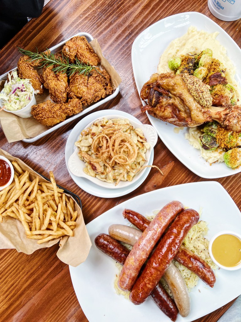 Whether you go with a large or small group there is one menu item you cannot skip – the soft pretzel. They offer a regular or giant size. I personally recommend the giant size because it is just more fun. Plus the giant size comes with all 3 of their dipping sauces – beer cheese, honey mustard and obatzda (kinda like an onion-garlic thick cheese spread). Their pretzels are so soft and buttery with a nice even sprinkling of salt. My next favorite appetizer is their currywurst. It is sliced brat served with fries and curry ketchup. It is a classic street food in Germany that you can find at almost every corner from street vendors! It is a tasty combination and the curry ketchup really adds a lovely flavor. Curry ketchup has a warm, spice flavor – think of curry powder that is mixed with ketchup. It cuts the sweetness and acid of the ketchup to make it a more rich, deep flavor that I could eat with everything. Being married to a German, we always have curry ketchup at the house because well, it is just better!