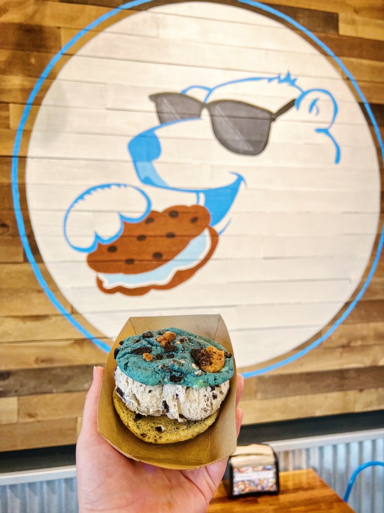 To order, you first select your base – you can choose a cookie or a brownie and with almost a dozen options, it might take you a minute. You can even mix and match, so you can try two! Next, pick your ice cream! They have flavors ranging from vanilla and cookie dough to s’mores and their popular bear batter (basically for extreme cookie lovers!). Next up, your toppings – you can top and roll your sandwich in a variety of options like sprinkles, cereal, m&ms and more! Then it is served to you for you to devour! You can even ask them to warm it up, which I know might sound crazy! Why would you warm up ice cream, it’s going to melt?! Well they only heat it up for a few seconds and it is to get the cookies (or brownie) warm so you bite into a warm cookie and cold ice cream for an unbelievable treat. My favorite combination is the cookie monster cookie for both with the Bear Batter ice cream and absolutely warmed up! A second favorite is the nutella chocolate chunk cookie with cookie dough ice cream!