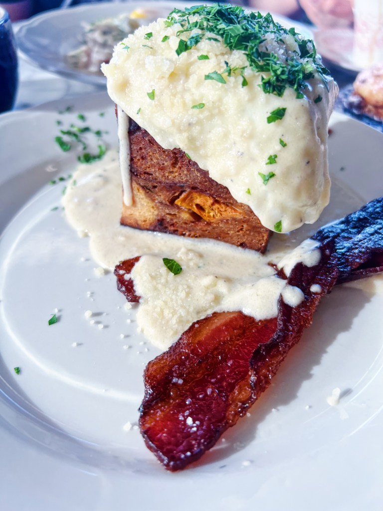 Don’t let the line intimidate you, it goes pretty quick and they are fast to turn over tables. I will note, unrelated to their food, they need a much better ordering process and flow of traffic. The same door you use to enter and exit is right by the counter where you order and doesn’t promote the best flow and can be tricky to get in and out without getting in someone’s way. Anyways, I am here to comment on their food – but it is a big pet peeve of mine. We grabbed a whole spread for breakfast. Had to start off with a classic cappuccino and their signature latte (The Harvey with housemade caramel milk). They definitely know how to make coffee, absolutely perfect. I loved the Harvey’s latte as well – it was sweet, smooth and silky. The caramel had a dark, rich flavor – almost on the edge of being burnt but in a good way. For food we ordered the Croque Madame, Strata, and a famous Raspberry Almond Croissant. The Croque Madame comes with ham, provolone cheese, dijon mustard, and bechamel on white bread with a runny egg on top. The bechamel sauce was so creamy and the dijon added a great, tangy contrast. 8/10 – would gladly eat again, it was just on the heavier side with the bechamel and ham. The Strata was a very interesting dish and not what I was expecting. I don’t know why I was expecting like a frittata type dish, but this was a hunk of something – I honestly don’t know how they managed to get it in to a cube shape and hold it together. But it was filled with sweet potatoes, mushrooms, gruyere cheese and topped with bechamel and a poached egg. It is served alongside slab bacon. The bacon was so crispy and salty and made a great dunker for the runny egg. It was smokey and nutty with a slight sweetness and it was phenomenal. The mushrooms really brought out all the flavors and added a rich, earthy flavor. 10/10 would eat this every single time – but next time I would split it with someone because it was a lot. I had to take the croissant home for later, but it made a tasty snack. The croissant was light and flakey and so buttery. The inside was stuffed with fresh raspberry jam and almond paste for a nutty, sweet combination. I was definitely in the top croissants I have had. I also love their Midnight Cowboy Croissant which is a chocolate dough stuffed with chocolate – a chocolate lovers dream.
