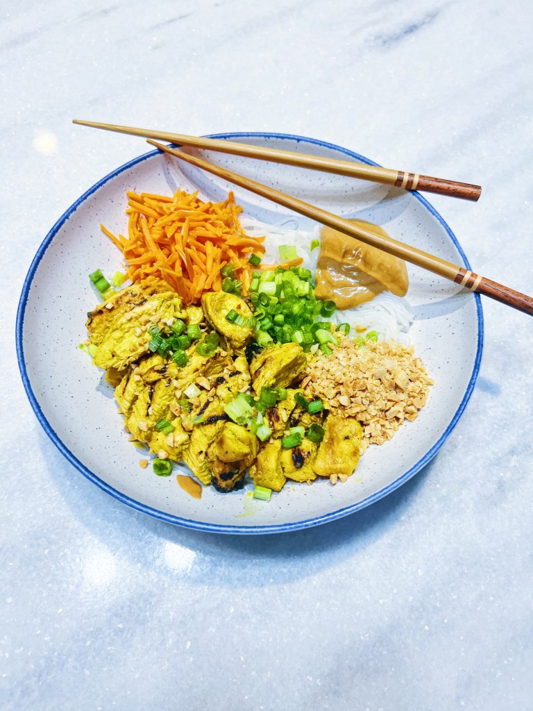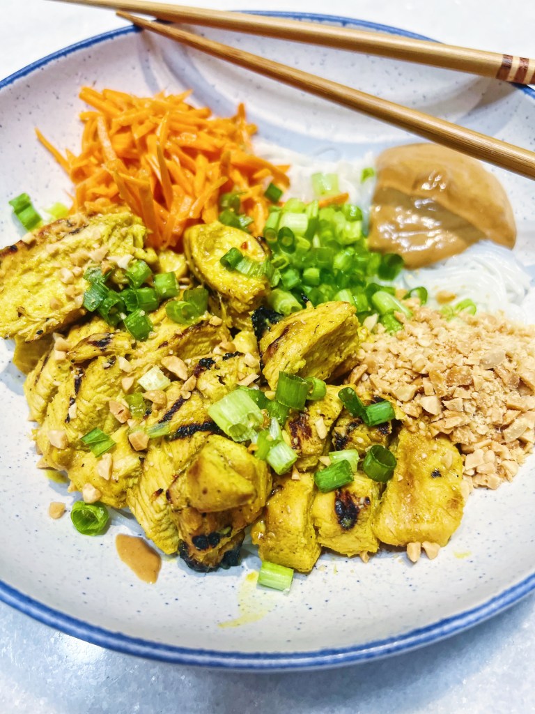 Noodle bowls are one of my favorite things – they are light, filling and so flavorful. This dish is inspired by one of my favorite spots in Seattle that has the best vermicelli bowls around! I wanted to create something similar at home so I can enjoy it all year round without having to get out! This one uses coconut milk to marinate the chicken so it keeps it juicy and tender and provides a rich, nutty flavor. If you have the time I recommend pickling carrots to go alongside this dish because they add the perfect tang and acid to balance the creamy chicken and rich, nutty peanut sauce! Skip the restaurant and make this instead for a fun dinner idea!