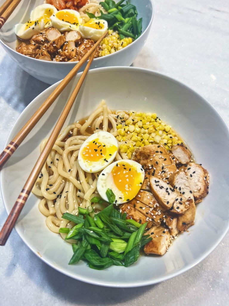 - Next it is time to assemble – divide the broth between 4 large bowls. Top each bowl with one chicken cutlet and one soft boiled egg. Divide the corn and udon noodles between the bowls and top with green onions and sesame seeds! Drizzle on sriracha for some heat, if desired and enjoy.