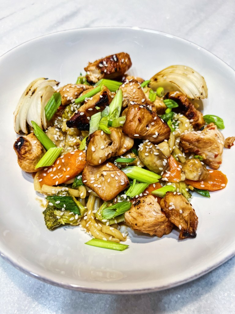 An easy stir fry that will have you licking the bowl and ditching the takeout! I opt for carrots, broccoli and mushrooms for my vegetables of choice, but you could easily swap these for some of your favorites – red bell peppers and snap peas would be great additions! The chicken marinade also doubles as a delicious sauce to coat the noodles as it thickens as it is cooked. This dish is a bit sweet, salty and spicy and the chicken is so tender. Make this when you are craving a warm bowl of delicious noodles!