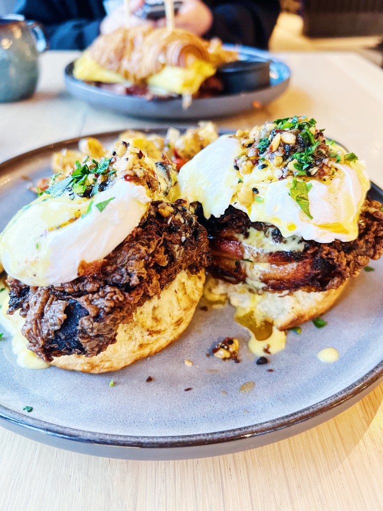 The Grange may be located inside a hotel in downtown Nashville, but that should not stop you from trying it! Their breakfast and brunch menus are ridiculously delicious and you should go with a group so you can try more of the dishes. I stopped in for breakfast on my last day in Nashville and it was the perfect send off. My husband and I had a hard time deciding what to order since it all looked so incredible, but in the end I went with the Fried Chicken Benedict (because I had to get one last fried chicken fix) and my husband went for the The Grange (extravagant croissant sammie). Both of these dishes were served with crispy potatoes that were hands down some of the crispiest, fluffiest little potato bites that I have eaten! The Fried Chicken Benedict ($16) starts with a fluffy biscuit, topped with crispy fried chicken, a runny poached egg, hollandaise, chili crunch oil, wildflower honey, and scallions. It was the most insane benedict I have probably ever had or seen but the flavors were sooo delicious. It has a sweet, spicy vibe going on with the creamy hollandaise and crunchy chicken. This dish was rather large, so I would recommend splitting it with a friend! My husband’s dish, The Grange ($16) starts with a warm, buttery croissant filled with smoked crispy bacon, shaved ham, dijon, sharp gruyere cheese, and soft scrambled eggs. It was divine, but I preferred my benedict. Overall this spot was a hit and we were both impressed with the quality and value. The food was tasty and the price was so reasonable for the large plates you get!