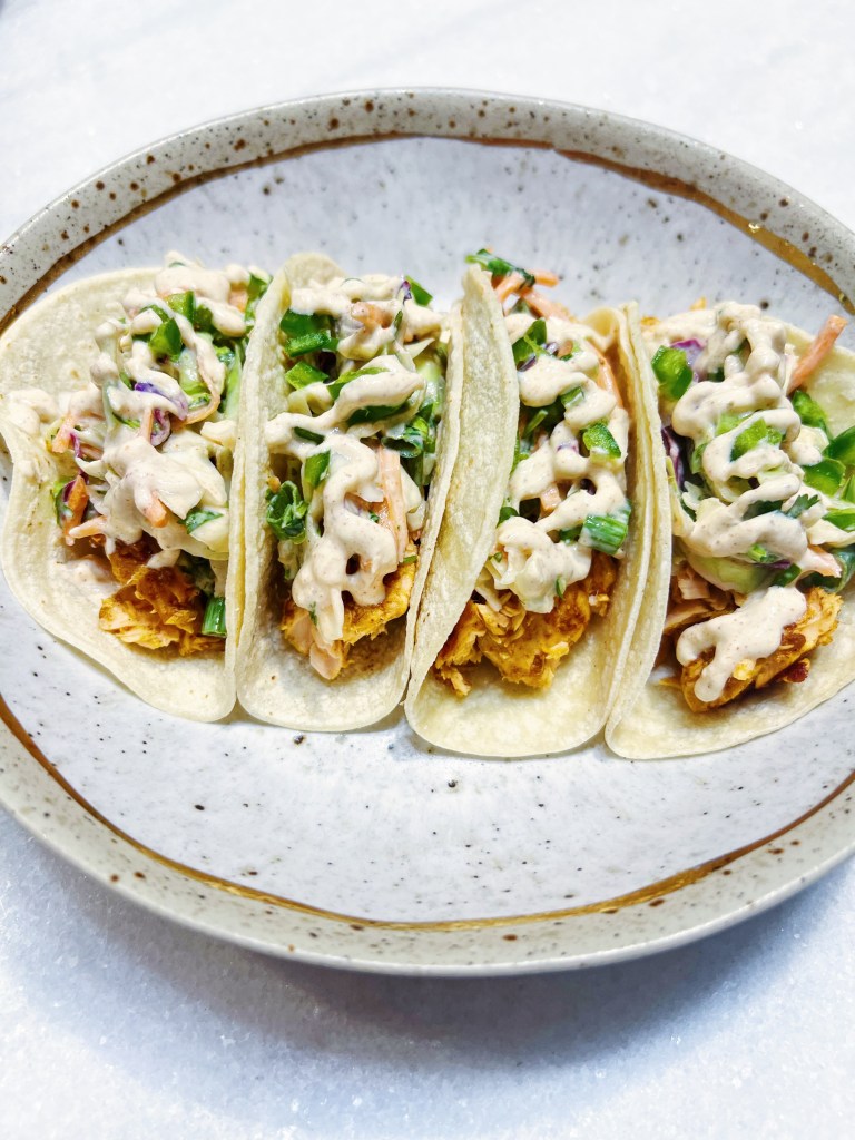 - To assemble, add a generous amount of salmon to a tortilla and top with the slaw. Drizzle on crema and diced jalapenos for extra toppings and serve with a wedge of lime!
