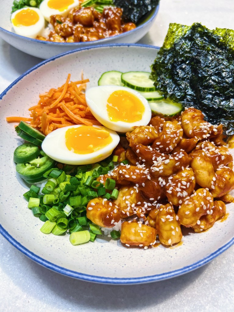 7. Next serve up your bowls – divide the shrimp between 4 bowls and serve with rice, sliced cucumber, pickled carrots, soft boiled egg, diced green onions and any other toppings you want!