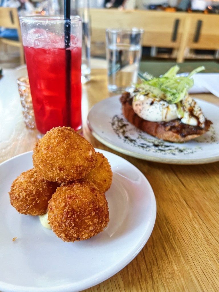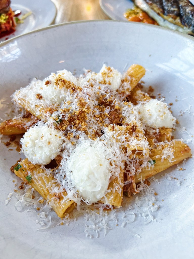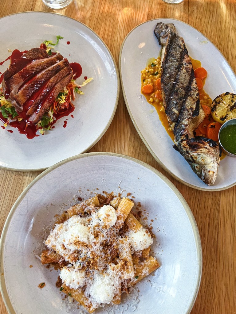 The menu is also incredible. Again, I did not expect to find such a culinary experience in this part of the world – let’s be real, Arkansas doesn’t exactly scream foodie town! Their menu is selective, but it allows them to be perfect each time. The offerings range from fish to tofu, so there is a dish for everyone on the menu. We started off with two appetizers – Croquettes ($12) and Burrata ($16). The croquettes were warm and bursting with cheese and potato goodness. Fried to perfection with a light, crispy crust formed on the outside. 10/10 would recommend these! The burrata was not exactly what I pictured. It was a piece of grilled bread topped with burrata, dates, almonds and celery. The burrata was creamy and rich, but I didn’t love how it was assembled. The flavors paired nicely and you had a sweetness from the dates with a crunch from the celery, but the overall dish just didn’t do it for me. For the mains we tried the Rigatoni ($26), Duck Breast ($32) and the Whole Branzino ($47). The rigatoni was my favorite with pork bolognese and a generous helping of fresh parmesan on top. The duck though was a surprise delight with a sweet and sour glaze that intrigued and delighted my tastebuds. The branzino was also cooked nicely with a salsa verde to add a freshness and brightness to the fish.