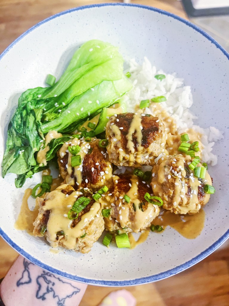 - Turn off the heat and remove the pan from the stove. Divide the meatballs between 4 bowls. Serve alongside rice and bok choy, if desired. Top the meatballs with sesame seeds, diced green onions, and drizzle with peanut sauce!