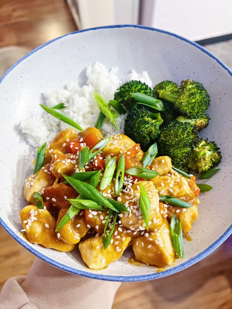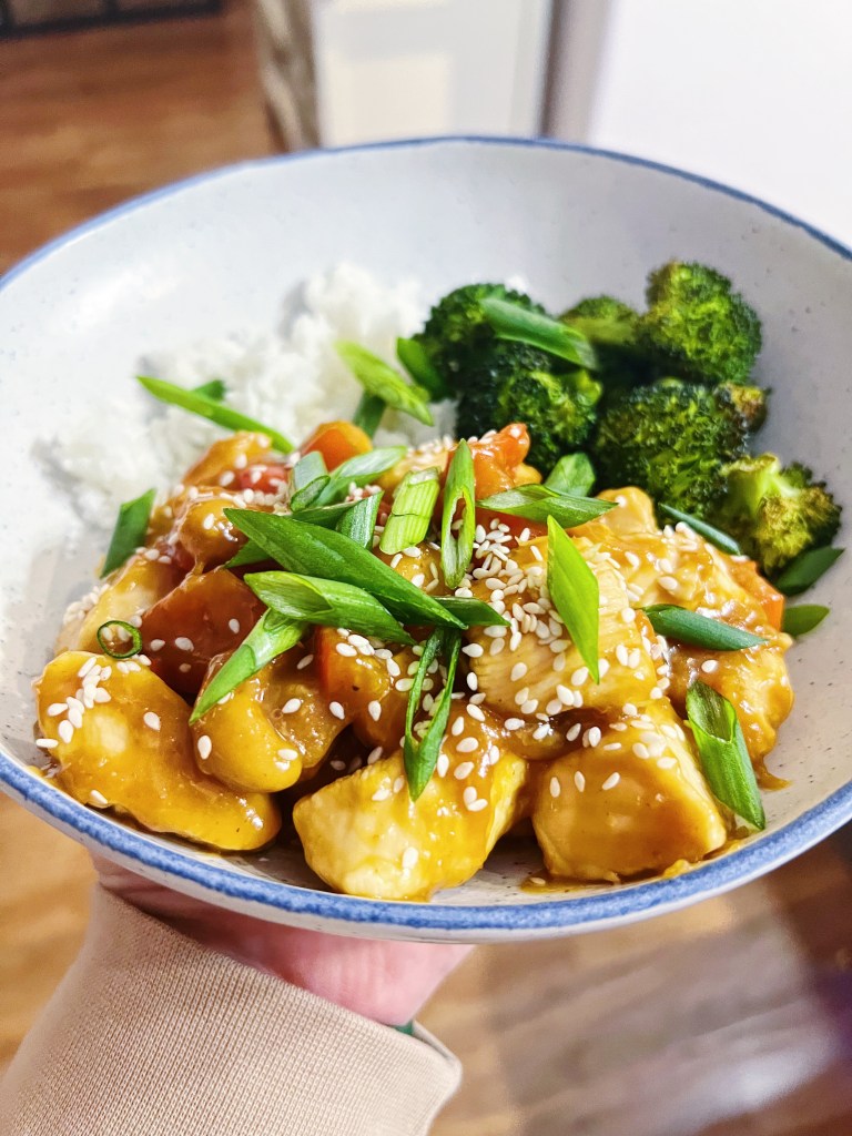 - Turn off the heat and remove the pan from the stove. Divide the chicken between 2-3 dishes and top with sesame seeds and green onions. Serve alongside rice and your favorite vegetable!