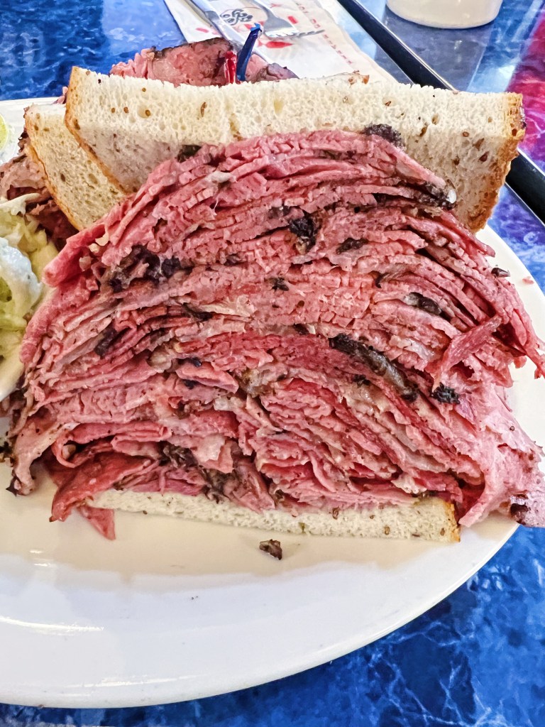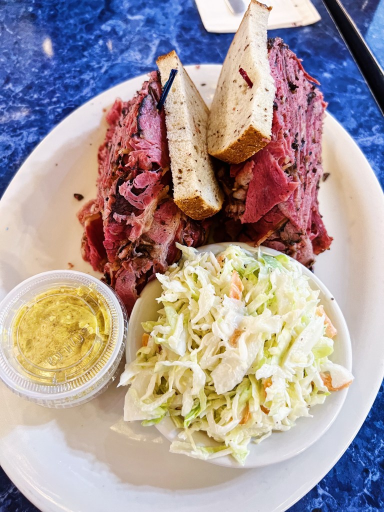 Harold’s is also known for their corned beef and pastrami and they definitely don’t mess around with their food. They also have a full pickle bar, with like a dozen different types of pickles – a real pickle lovers dream! We grabbed a Pastrami Sandwich, which I am pretty sure had a whole pound of beef on it; and we took a slice of classic NY style cheesecake to go – there was no way we could eat anything else with all that meat in our stomachs. The sandwich came with coleslaw, mustard, and the pickle bar. The pastrami was surprisingly delicious and so tender – I also loved that there weren’t just fatty chunks – it was super thinly sliced and just melted in my mouth. If pastrami isn’t your jam though, they have a whole menu with just as delicious (and large) dishes. I will say now though that a sandwich and slice of cheesecake will set you back about $60, but it could feed 2-3 people easily!