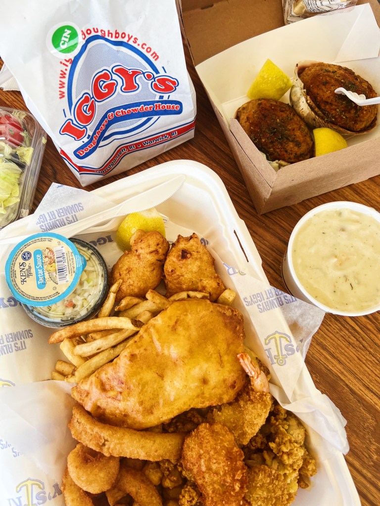 Iggy’s is a Rhode Island icon and a staple! If you are from Rhode Island or even spent time there, Iggy’s is one of those places you have definitely been to. As someone who spent 4 years in Rhode Island, Iggy’s will always have a place in my heart. Back when I lived in Rhode Island though, the Iggy’s by me (in Narragansett) was only open during the summer months, which was devastating – it was also a shack, not a full restaurant like it is now! Iggy’s is most famously known for their chowder and doughboughs, but they have a ton of seafood on their menu. And nothing screams summer like fresh chowder and hot doughboughs covered in cinnamon sugar. Boy do I miss those days, so you better believe the first stop in Rhode Island was to Iggy’s. It was also my husband’s first time in Rhode Island so it was my job to show him all the best places and stuff him full of seafood!