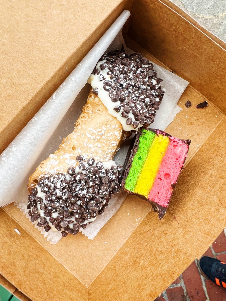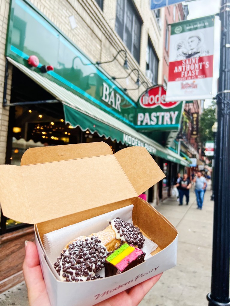 So let’s dig into it. Modern Pastry is smaller with fewer locations than Mike, but you’ll still find all the classic Italian desserts on their menu. If you’re in the know, their North End location also has “Modern Underground” which is a whole bar and grill serving up breakfast, lunch and dinner. (Mike’s definitely doesn’t have this). To make my comparison of the two shops fair, I grabbed a classic cannoli with chocolate chips from Modern; I also grabbed a rainbow cookie for fun! Modern’s cannoli are much smaller and have fewer flavor options, but they are also filled fresh to order. Their cannoli shells are very similar to Mike’s – super crunchy and flakey. Modern’s ricotta was lighter and not as thick, which I really enjoyed but the texture wasn’t as creamy or soft and velvety. And maybe a bit sweeter. Overall the cannoli was super delicious and I don’t think you can go wrong with Modern or Mike’s. If you prefer more flavor options and a thicker cream, then Mike’s is gonna be the spot for you; but if you’re looking for more classic cannoli with a lighter filling, then Modern is the way to go! But I mean if you’re eating fresh cannoli, you really can’t go wrong!