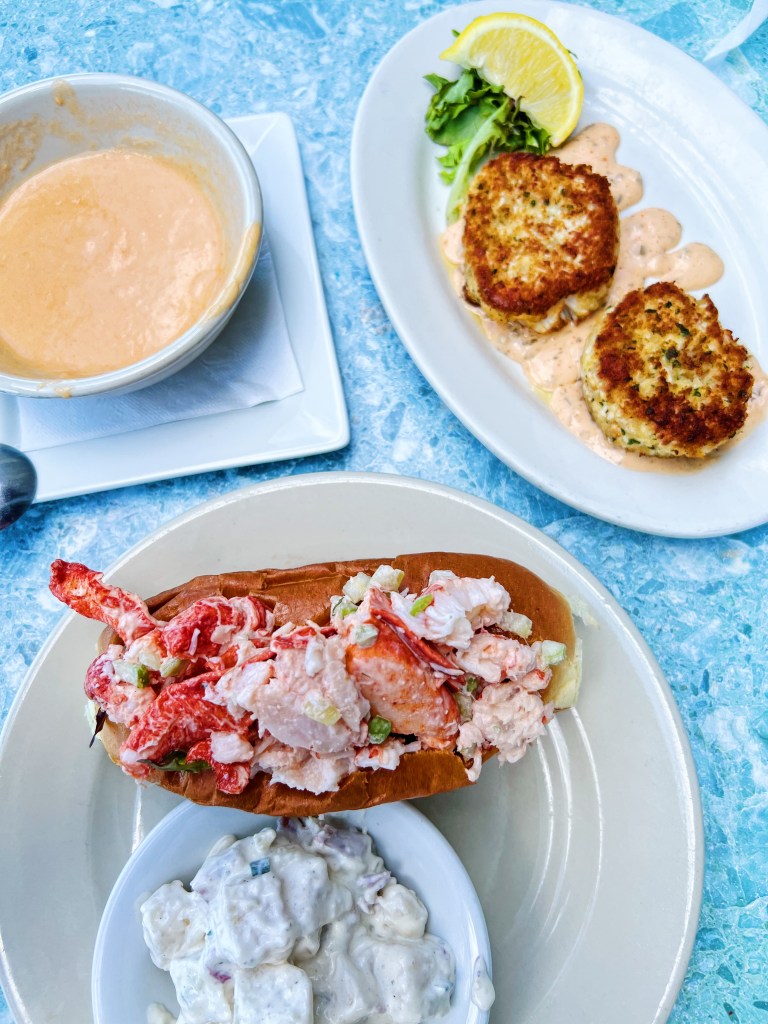 While Newport is a bit of a drive and you’ll spend a few dollars crossing the bridge, it is so worth visiting. And the main downtown area is super walkable, so you can park and just walk the town and waterfront before grabbing a bite here. During the summer months (May-September), Newport is absolutely buzzing with locals and tourists for the beach season! Now this spot is known mostly for their lobster, like the name suggests and you’ll find lobster rolls both ways, whole lobsters, lobster bisque, a lobster burger, and even a lobster pizza! If lobsters aren’t your thing though, they also have other seafood options. On my recent visit to Rhode Island, I popped in for lunch and grabbed a Traditional Lobster Roll, Lobster Bisque, and Seafood Cakes. I love their lobster rolls and I went with the traditional cold version mixed with mayonnaise, celery and dill served on a buttery roll. The lobster is fresh and tender and well seasoned. But my favorite dish I had was the Seafood Cakes – I was actually shocked with how good they were. They were golden brown on the outside with a nice crunchy and so butter and soft on the inside and that remoulade they came with was just fantastic!