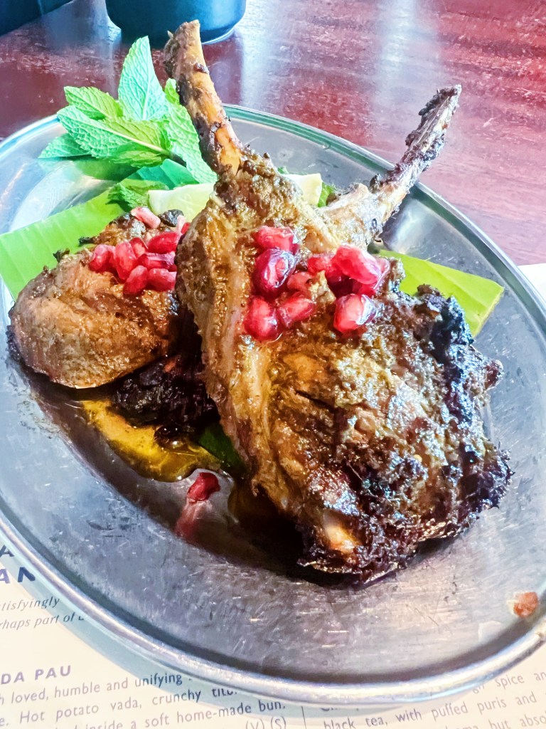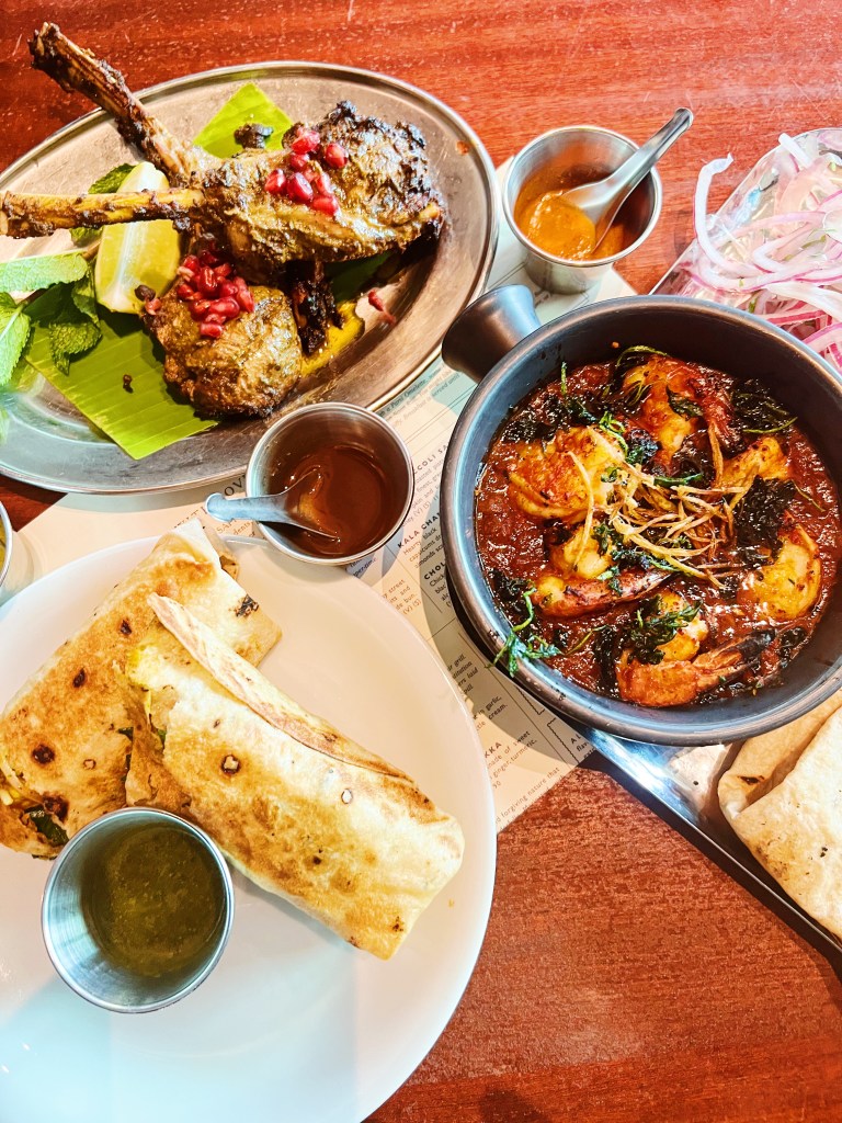 For starters, I always order either the Paneer Roll or the Chicken Roll – both are wrapped in a flakey, buttery flatbread and are so flavorful with a fresh, mint chutney to dunk in. My other favorite small plates are: Chili Chicken and Pau Bhaji. The Chili Chicken is so crispy in a ginger, garlic, and soy marinade that is a little sweet, a little tangy, and a little spicy. The Pau Bhaji is the complete opposite of the chicken – it is soft and buttery with a richness to it. It is smashed vegetables that are served with these fluffy, buttery buns that you eat it with.