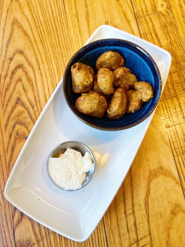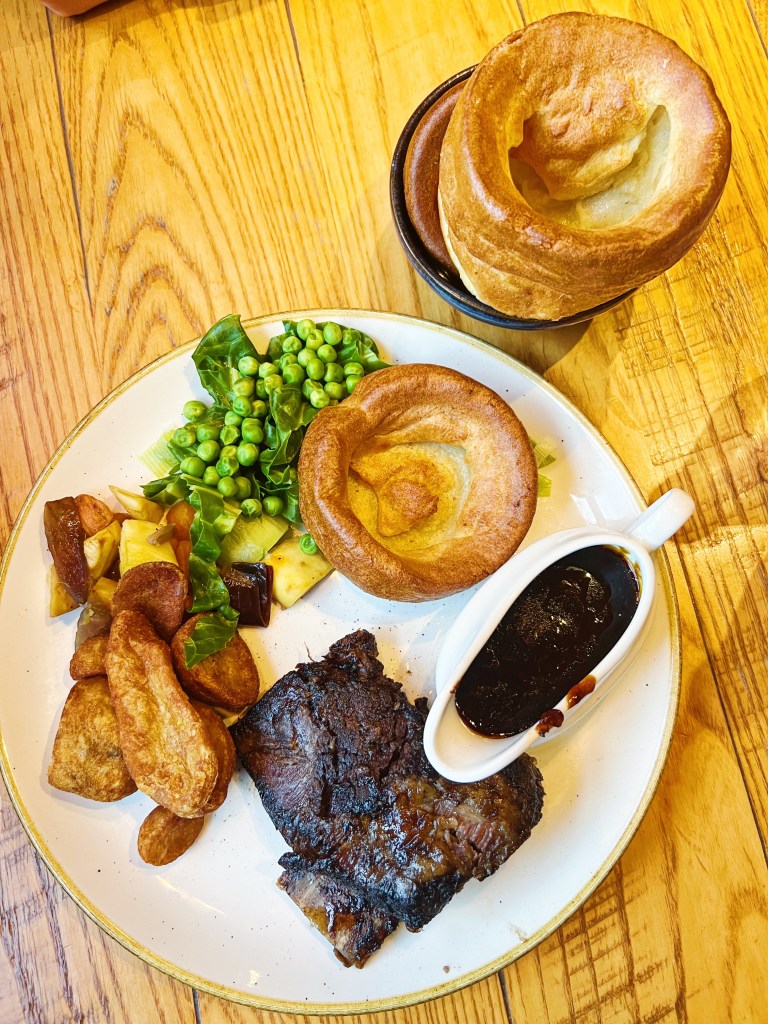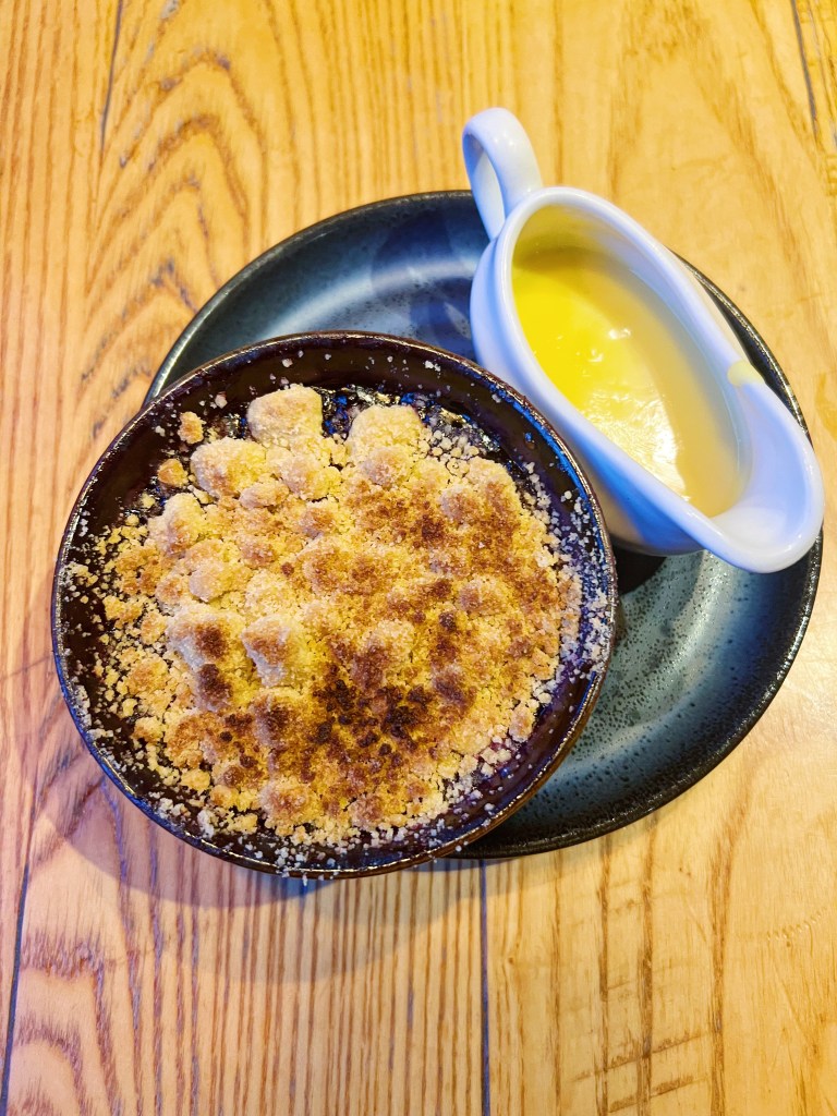 They not only have a full menu, but they offer brunch and a special Sunday menu as well. Sundays in England are known for one thing – a Sunday Roast. If you are in England on a Sunday then you have to get a Sunday roast, there is nothing better. Their Sunday menu is also a super good deal with 5 roasts to choose from or you can do the trio to try a few! With their Sunday menu, you can also get certain appetizers and desserts for only 2.50 pound each! We went with the roast pork belly and ordered an extra Yorkshire pudding so we wouldn’t have to share! The pork was so tender it fell off the bone and had such a deep, rich flavor. The crispy potatoes and parsnips were a wonderful addition and dunked in the gravy it made it even more tasty. To start we tried the crispy beer battered mushrooms served with a garlic mayonnaise. These tasted way better than I expected them to, and the garlic mayo gave them a creamy, tanginess that they needed. And of course we couldn’t skip dessert! We grabbed the crumble with warm custard and it blew us away! I loved the tartness of the berries with the buttery, crunchy crumble on top. But that custard was so creamy and silky and I would put it on every dessert.