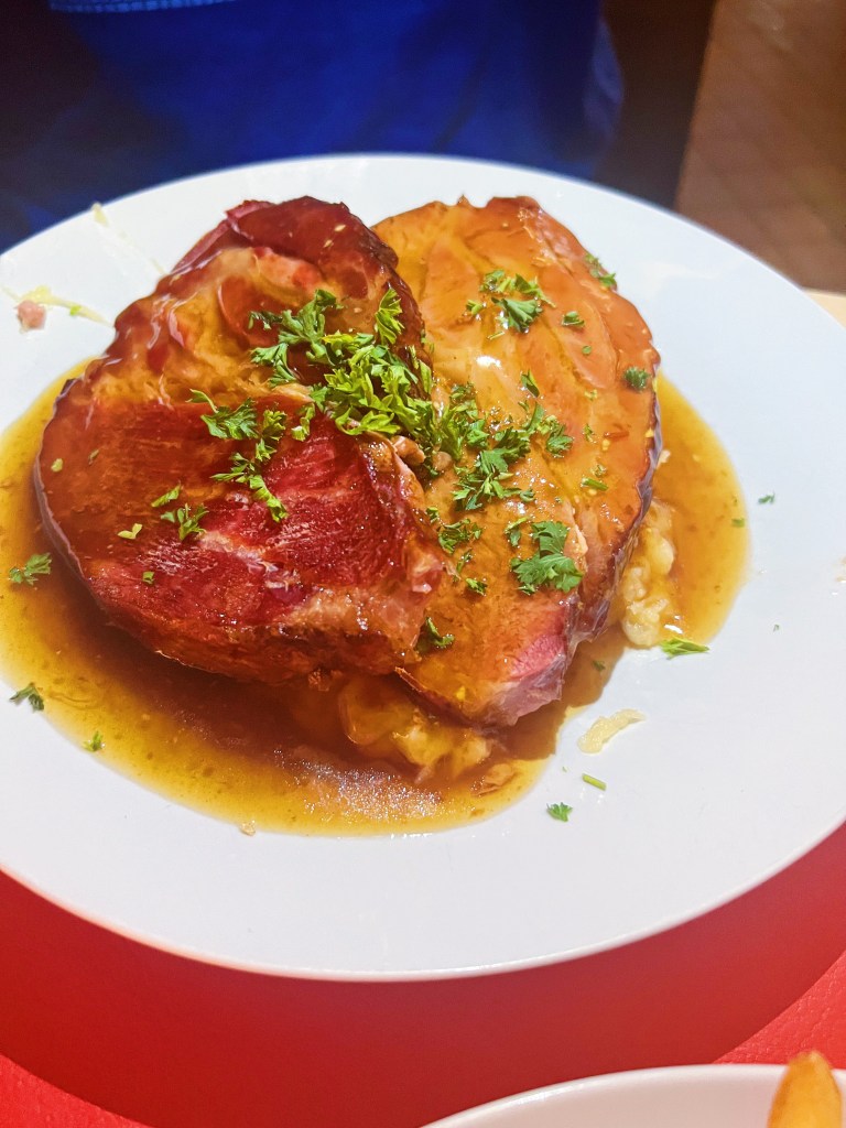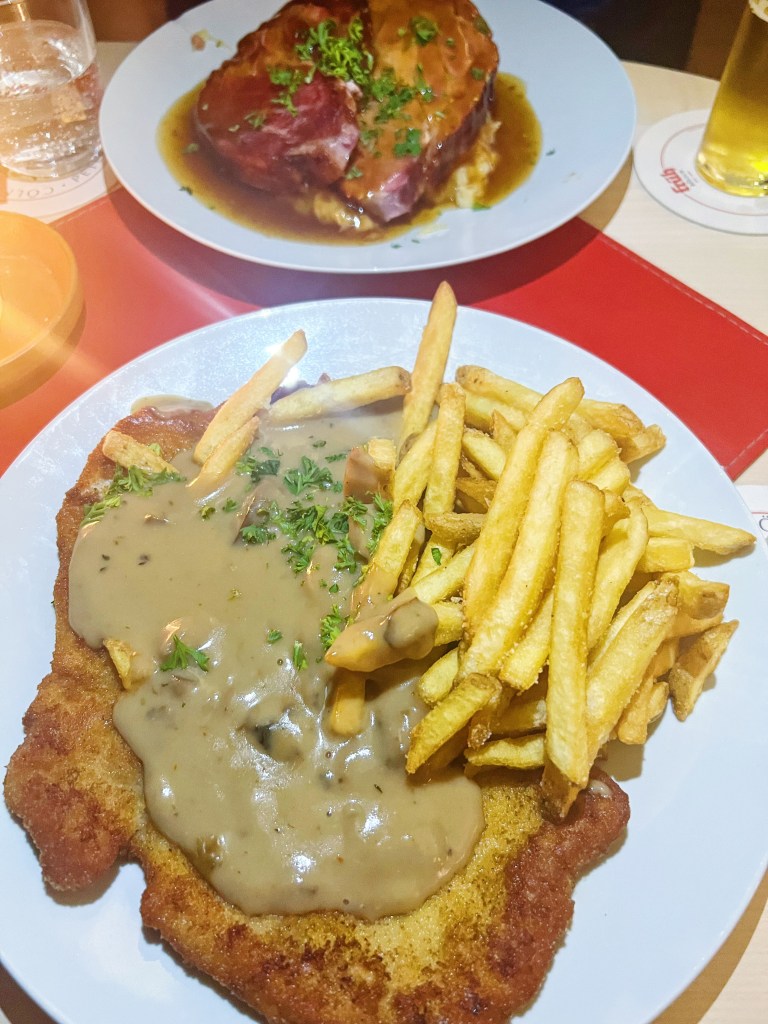 Of course, hubby and I both grabbed a cold Fruh Kolsch beer to enjoy with our meal. The beer is light and crisp and not overly bitter or hoppy. I am not the biggest beer fan (which I definitely did not say out loud in Germany), but this beer was nice and smooth and light. Now I wouldn’t personally be able to drink a lot of these, but if I wanted to enjoy a cold beer, this would be a go to for me! For our dishes, we had to get some classics. I ordered their Schnitzel with a mushroom cream sauce that came with fries and my husband ordered the Kassler. Kassler is a smoked pork chop (that is massive) served with mashed potatoes mixed with sauerkraut and a brown gravy. The pork is so tender and falls apart – this is definitely a great meal to eat to soak up all the beer. Their schnitzel was my fav though, it was so crispy, but still moist inside and the mushroom sauce is just the perfect topping. It adds so much flavor without being overpowering.