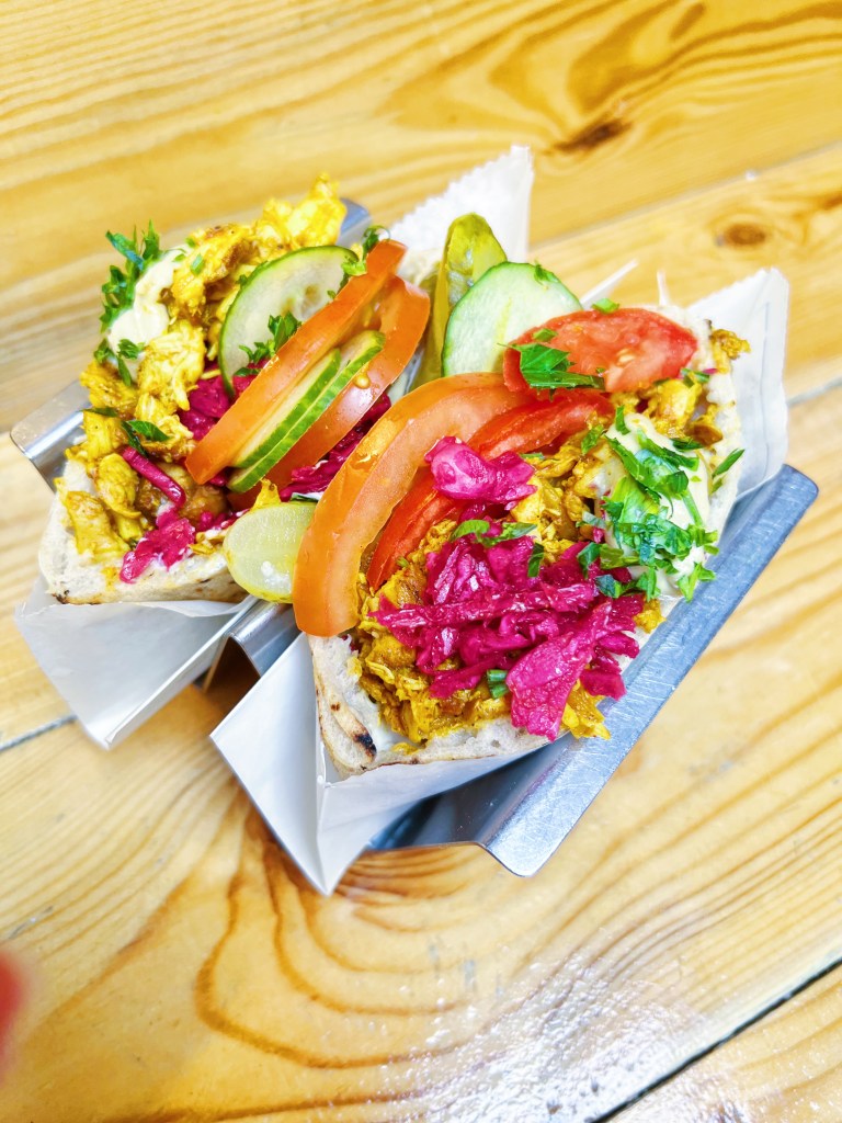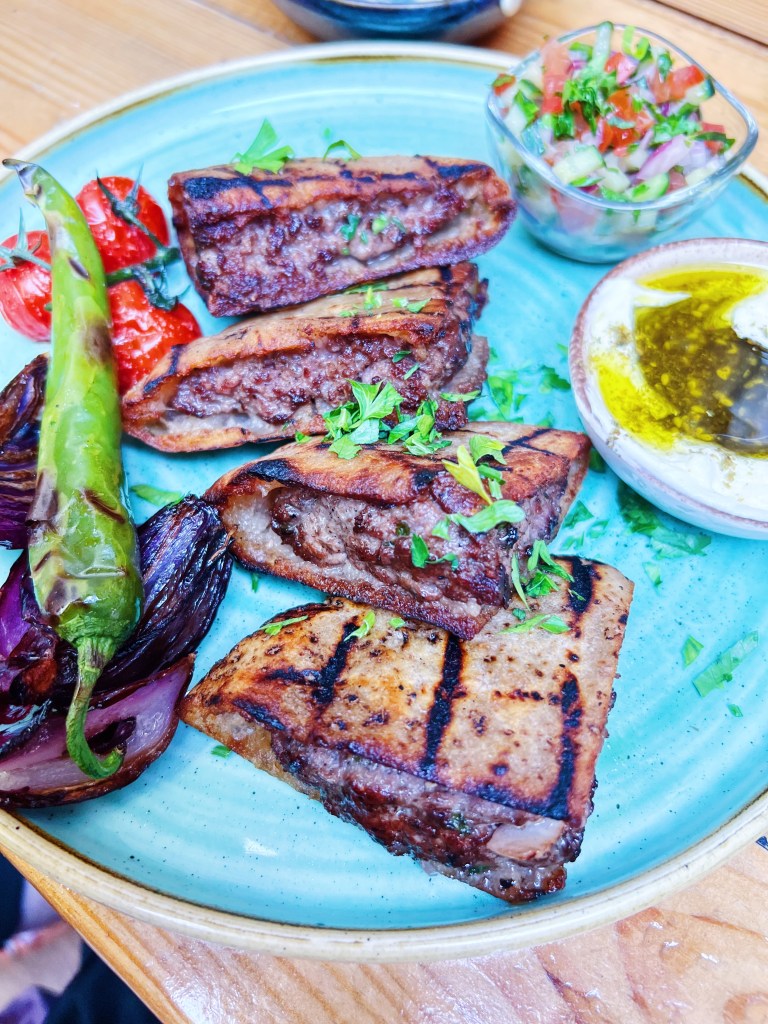 This platter alone was enough for two people, but we couldn’t resist trying more of Shouk’s delicious offerings. Next up were the arayes, perfectly seasoned and charred Lebanese-style meat pastries that were utterly addictive. We also indulged in the chicken skewer pita, which was stuffed with tender grilled chicken thighs, juicy tomatoes, crunchy onion, fresh parsley, and topped with tangy pickled onions.