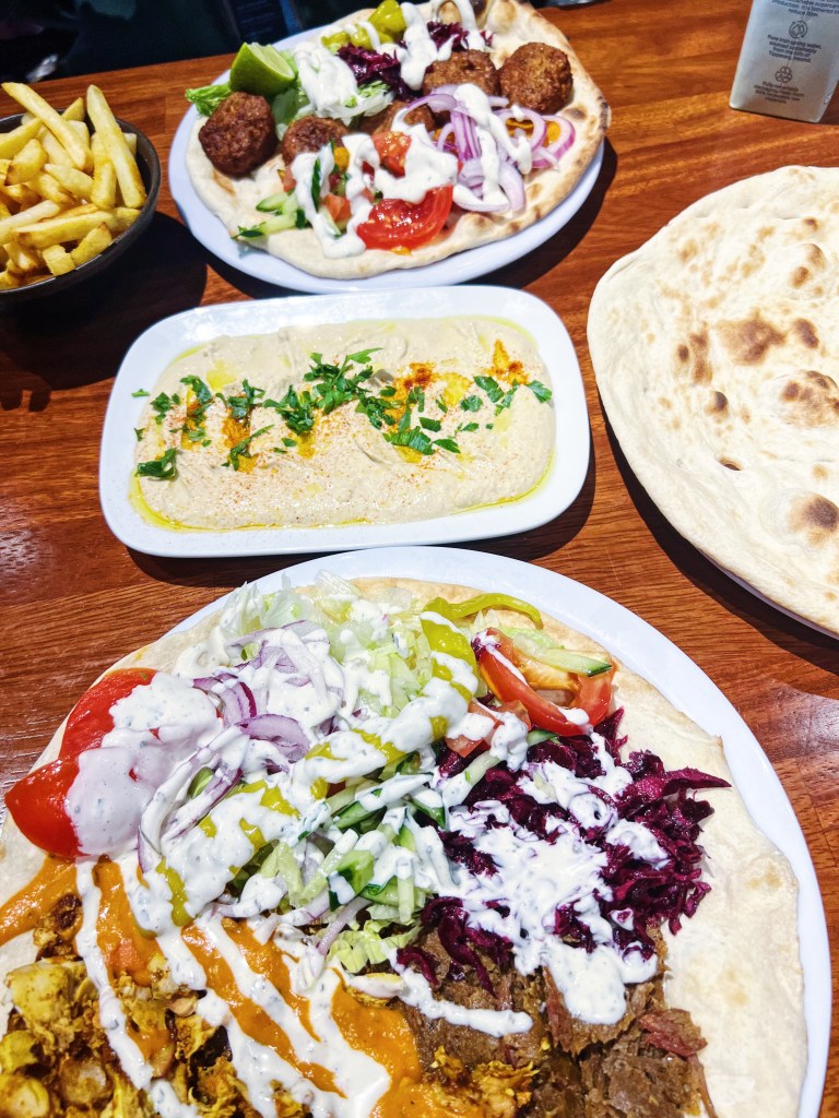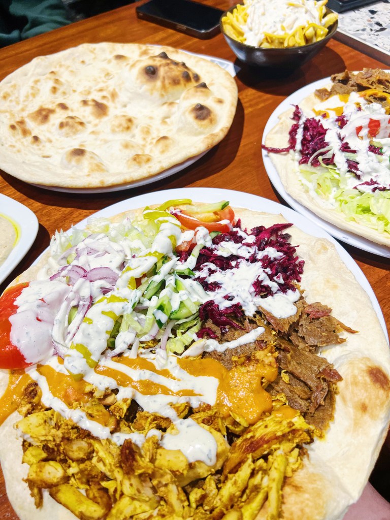 We started with the hummus, which was creamy and luscious – the perfect dip to start our meal. But the real stars of the show were the Doner dishes. I opted for the mixed Doner, which came with tender lamb and chicken, cucumbers, cabbage, tomatoes, onions, creamy garlic sauce, and a chili sauce that added a nice kick without being too spicy. The falafel Doner was another highlight, with crispy, flavorful falafel taking center stage. What truly set the Doner pitas apart was the texture – super crispy on the edges, but still soft and fluffy on the inside. It was the perfect vessel for the delicious fillings.