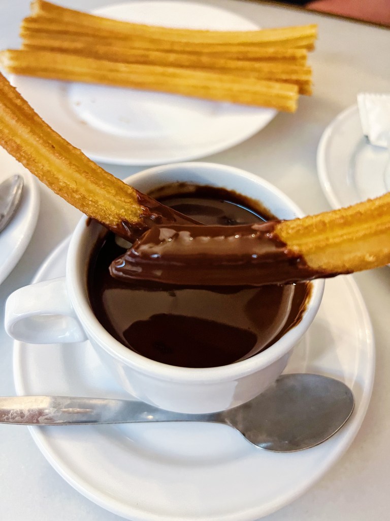 The Churros at San Gines aren’t the sweet, cinnamon-coated treats you might be used to in the US. Instead, these Churros are a bit more oily and come plain, served piping hot alongside a rich, thick chocolate dipping sauce. We opted for the thin Churros, which were crispy on the outside and fluffy on the inside – perfect for dunking in the decadent chocolate.