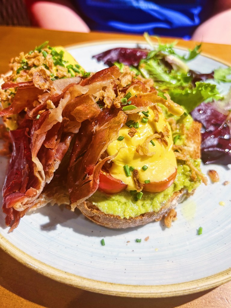 We started our day with a round of mimosas, because, well, it’s vacation, and why not?! The drinks were perfectly crafted, and we were ready to take on the menu. Our first dish was the Dulce de Leche Pancakes, smothered in a creamy, tangy dulce de leche, sliced almonds, and ice cream. While the flavor was incredible, I have to admit that the pancakes were a bit denser than what I’m used to in the States. The texture wasn’t quite my favorite, but the flavors were so good that it didn’t detract from the overall experience. Next up was the Eggs Zenith, a dish that exceeded my expectations in every way. The toasted English muffin was topped with smashed avocado, jammy eggs, tomatoes, hollandaise sauce, and crispy bacon. It was a flavor bomb that had me scraping the plate clean.