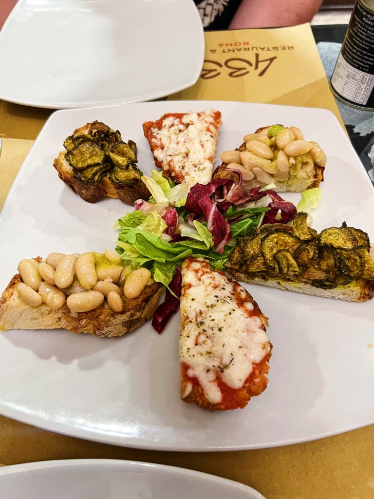 My husband and I had an absolutely incredible dinner here. We started with the bruschetta trio—which, I’ll admit, I thought I had ordered something different, but these things happen when you don’t speak the local language very well! It ended up being a wonderful surprise. The trio came with three varieties: one with grilled zucchini, one with melty mozzarella and tomatoes, and one with marinated navy beans. The zucchini was our favorite, but it was a lovely start to the dinner, and we enjoyed the variety.